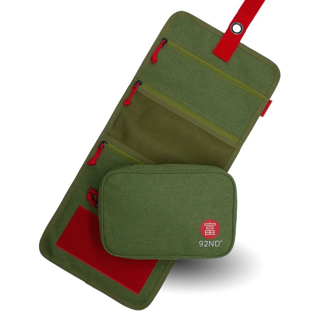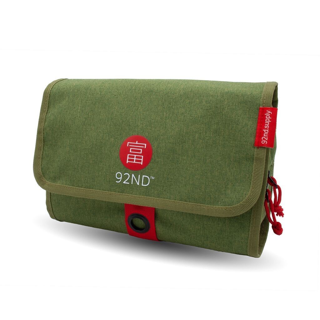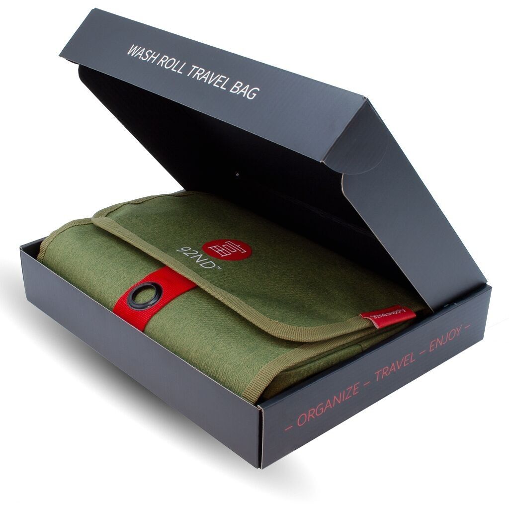 Der 92ND.SUPPLY Washroll Kulturbeutel in Grün ist die ideale Lösung für Damen und Herren, um Toilettenartikel auf Reisen geordnet zu verstauen. Mit einer durchdachten Aufteilung bietet er viele Fächer, darunter eine Netztasche und abnehmbare Fächer, alle sicher mit Reißverschlüssen verschlossen. Die praktische Aufhängung an Öse und Klettverschluss sorgt für einfachen Zugriff in jedem Badezimmer. Leicht zu reinigen und stilvoll in Seidenpapier und Geschenkbox verpackt, misst der Kulturbeutel 61 cm x 27 cm und bietet ausreichend Platz für alle wichtigen Utensilien.