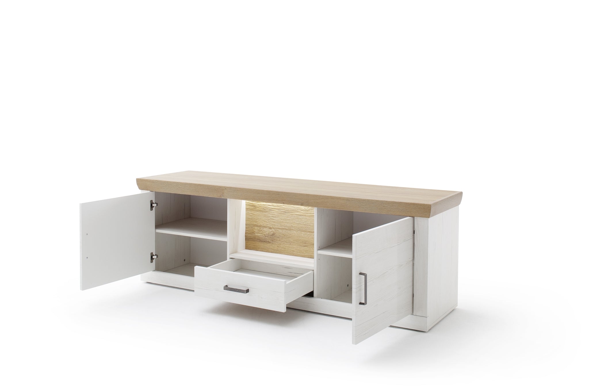 - Rückwand: sichtbar: 3D Balkeneiche Nachbildung geschroppt hinter Türen & Schubkästen: Balkeneiche Nachbildung