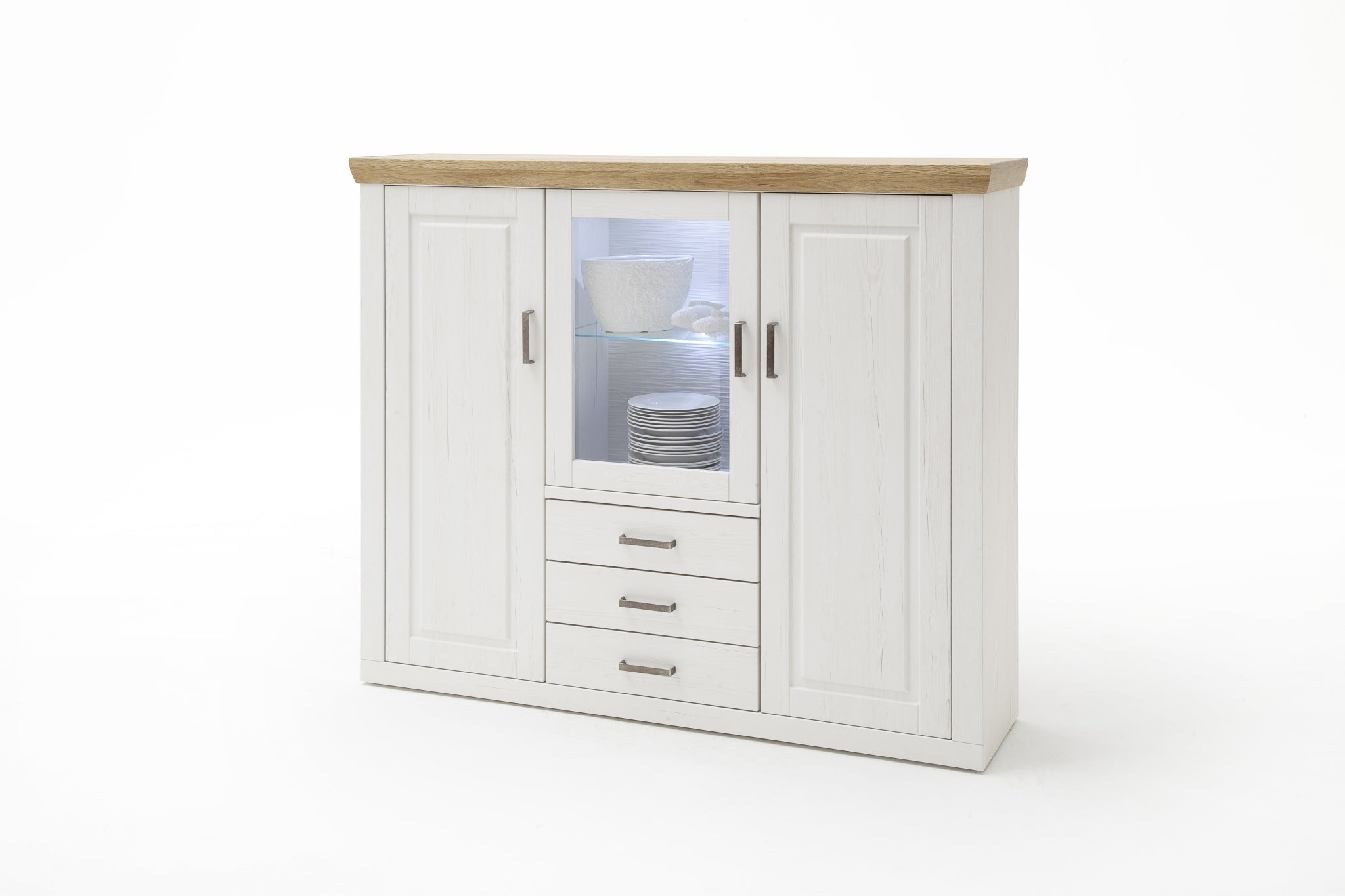 - Rückwand: sichtbar: Pinie Aurelio 3D geschroppt hinter Türen & Schubkästen: weiß Nachbildung