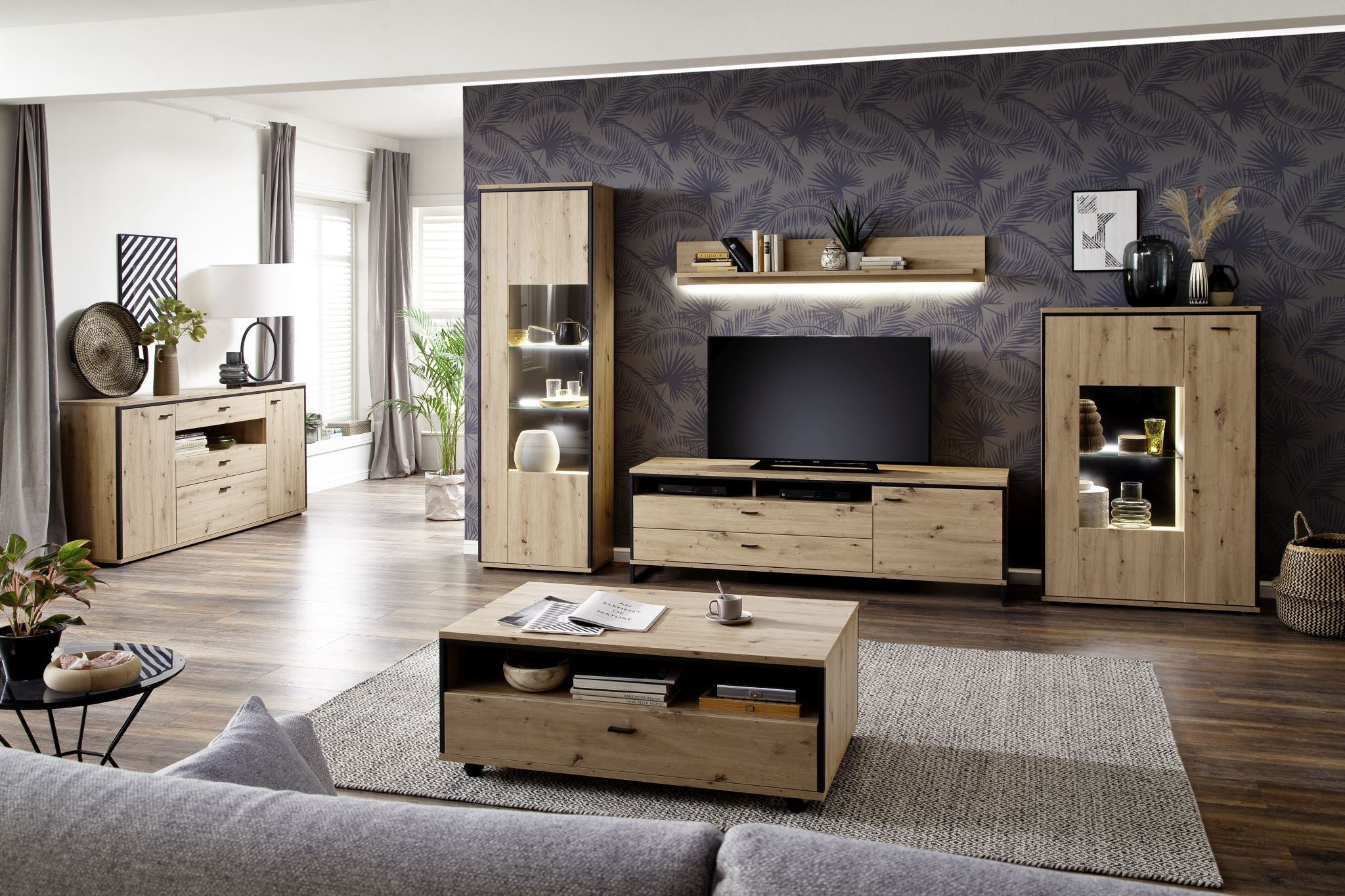- Rückwand: sichtbar: Pinie Aurelio 3D geschroppt hinter Türen & Schubkästen: weiß Nachbildung