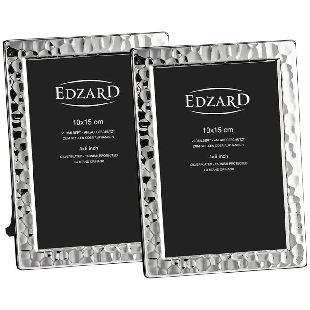 Entdecken Sie das edle 2er Set der EDZARD Bilderrahmen Pavia. Hergestellt von der renommierten Silberwarenmarke EDZARD seit 1975, bieten diese Rahmen eine solide und massive Verarbeitung in edler Optik. Der spezielle Anlaufschutz schützt den Rahmen vor Verfärbungen, wodurch eine einfache Pflege mit einem feuchten Tuch ausreicht. Dieser versilberte und gehämmerte Rahmen eignet sich besonders für besondere Anlässe wie Geburtstage, Kommunionen, Hochzeiten und Weihnachten. Der Samtrücken verleiht dem Rahmen eine besonders edle Note. Der Rahmen ist sowohl senkrecht als auch waagerecht aufstellbar und mit zwei Aufhängevorrichtungen für die Wand versehen.
