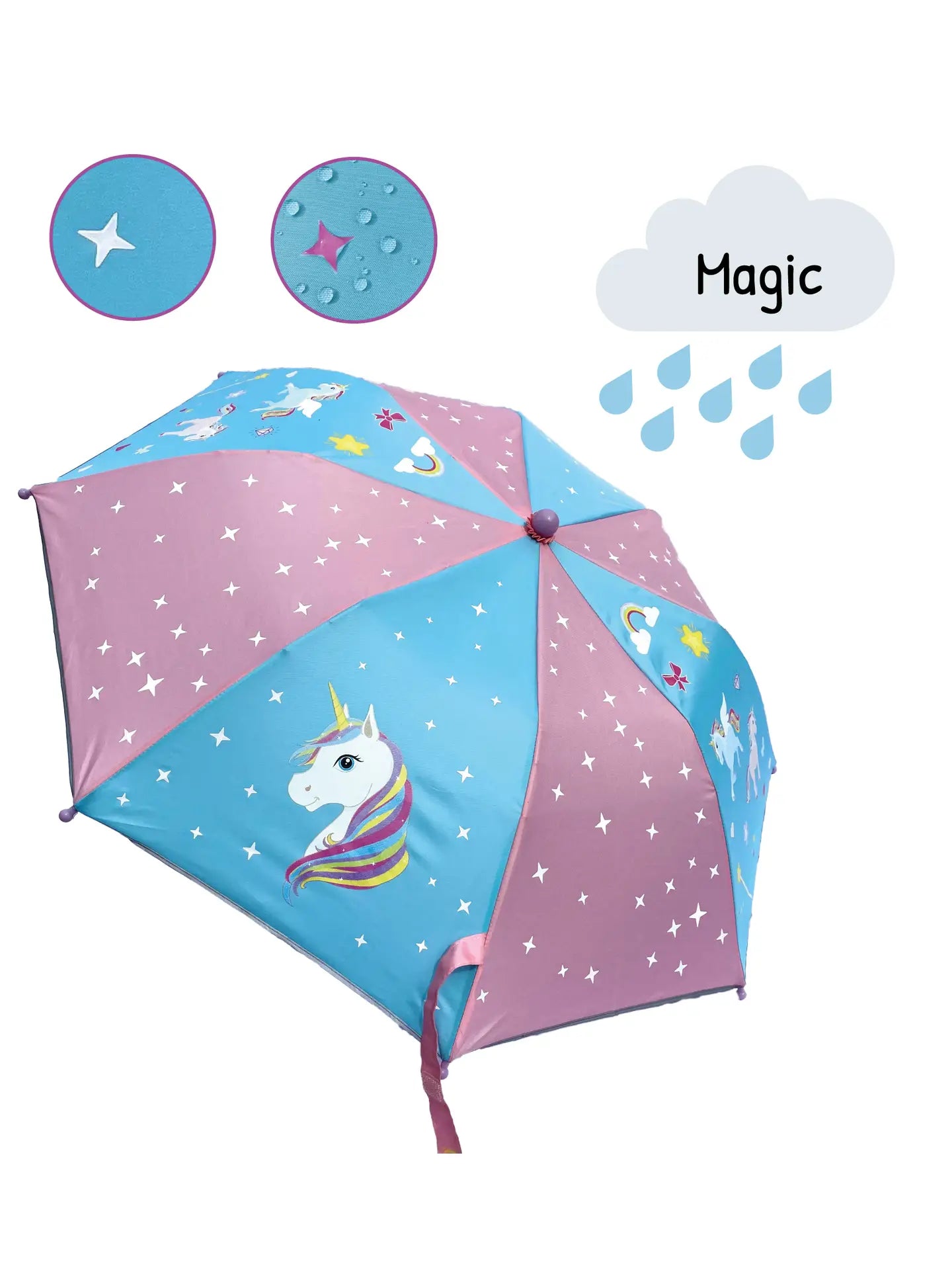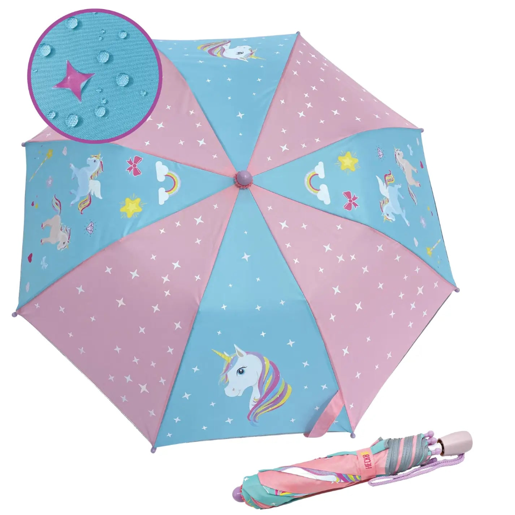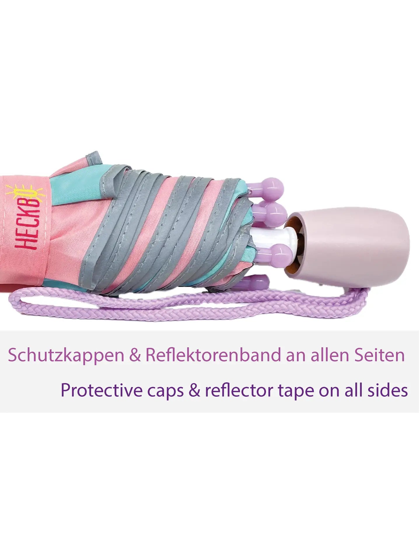 Der HECKBO Magic Faltregenschirm ist ein besonderes Accessoire für Kinder, da er bei Nässe die Farbe wechselt! Die weißen Sterne verwandeln sich in rosa Sterne, sobald der Regenschirm nass wird. Für höchste Sicherheit im Straßenverkehr ist der Schirm rundum mit reflektierenden Streifen ausgestattet, die eine 360° Sichtbarkeit gewährleisten, selbst bei schlechten Lichtverhältnissen. Dieser Taschen-Kinderschirm von HECKBO besteht aus einem robusten Metallgestell und wasserdichtem Polyestergewebe, das nicht nur vor Regen und Wind, sondern auch vor schädlichen UV-Strahlen schützt. Das kinderfreundliche Öffnen und Schließen ermöglicht eine einfache Handhabung. Nach Gebrauch kann der zusammengefaltete Regenschirm problemlos im Schulranzen oder Turnbeutel verstaut werden. Zusammengefaltet hat er eine Länge von 32 cm, aufgeklappt 50 cm und einen Durchmesser von 76 cm.