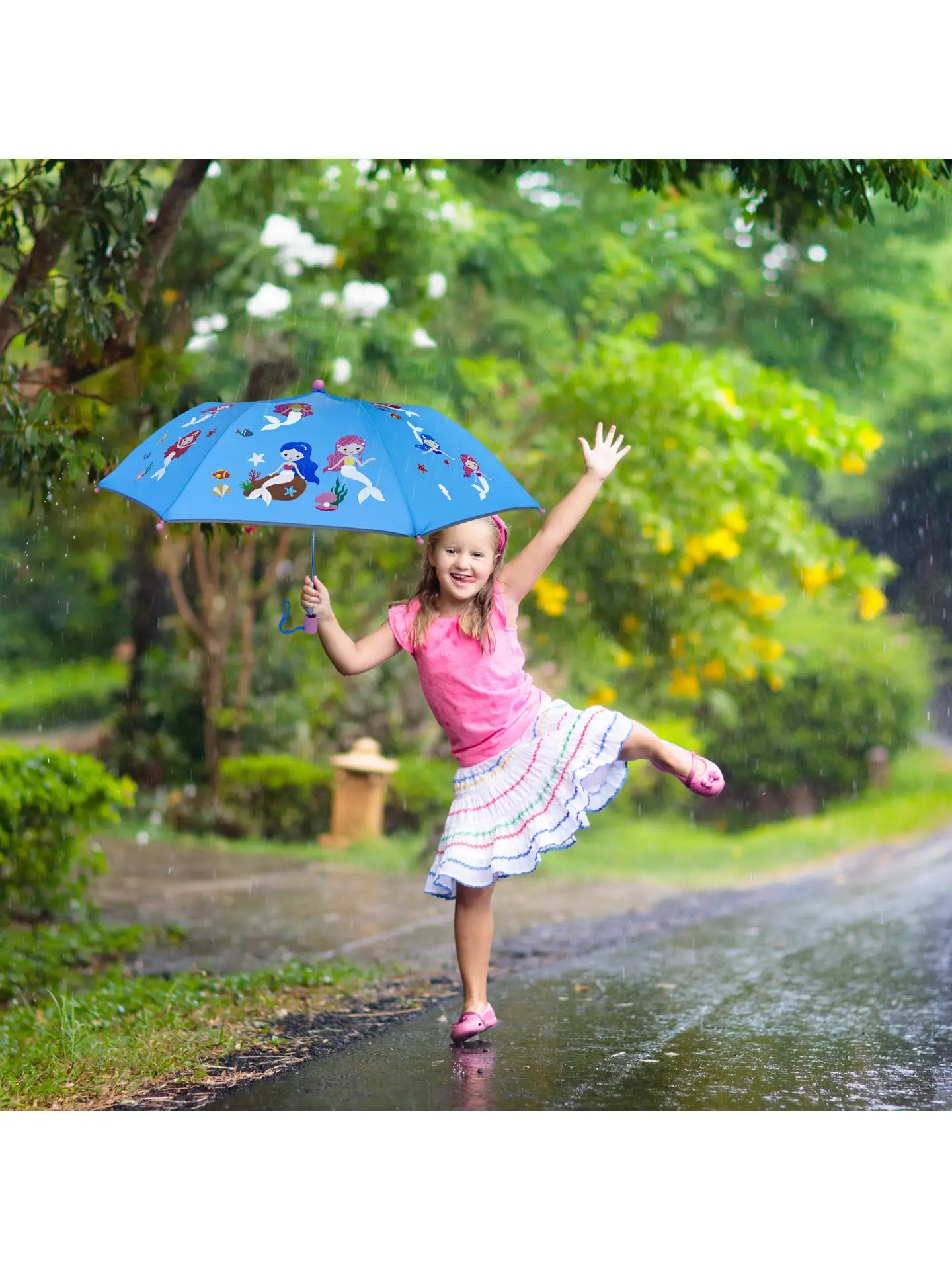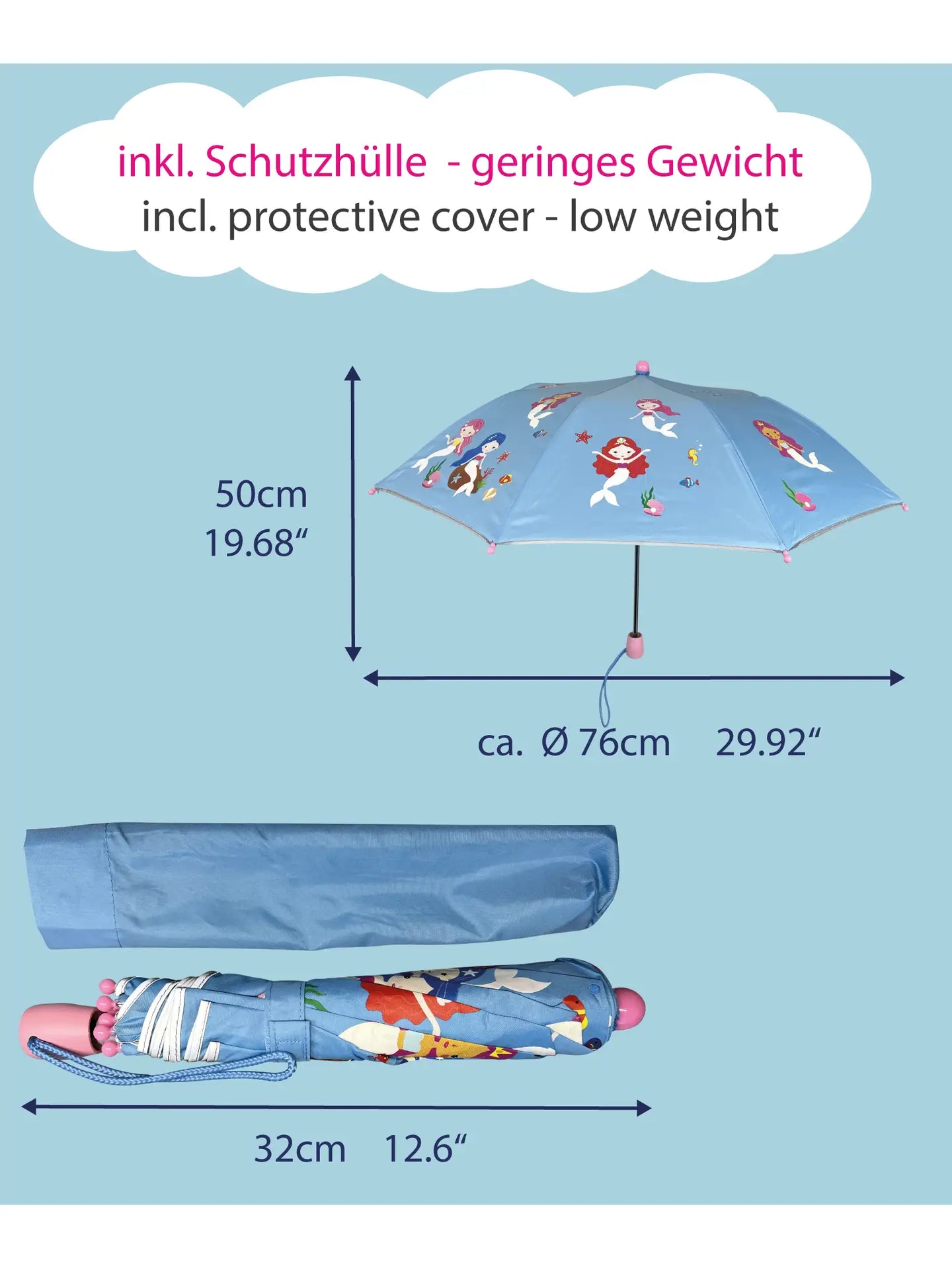 Der HECKBO Magic Faltregenschirm ist ein besonderes Accessoire für Kinder, da er bei Nässe die Farbe wechselt! Die weiß überdeckten Motive verwandeln sich in bunte Motive, sobald der Regenschirm nass wird. Für höchste Sicherheit im Straßenverkehr ist der Schirm rundum mit reflektierenden Streifen ausgestattet, die eine 360° Sichtbarkeit gewährleisten, selbst bei schlechten Lichtverhältnissen. Dieser Taschen-Kinderschirm von HECKBO besteht aus einem robusten Metallgestell und wasserdichtem Polyestergewebe, das nicht nur vor Regen und Wind, sondern auch vor schädlichen UV-Strahlen schützt. Das kinderfreundliche Öffnen und Schließen ermöglicht eine einfache Handhabung. Nach Gebrauch kann der zusammengefaltete Regenschirm problemlos im Schulranzen oder Turnbeutel verstaut werden. Zusammengefaltet hat er eine Länge von 32 cm, aufgeklappt 50 cm und einen Durchmesser von 76 cm.