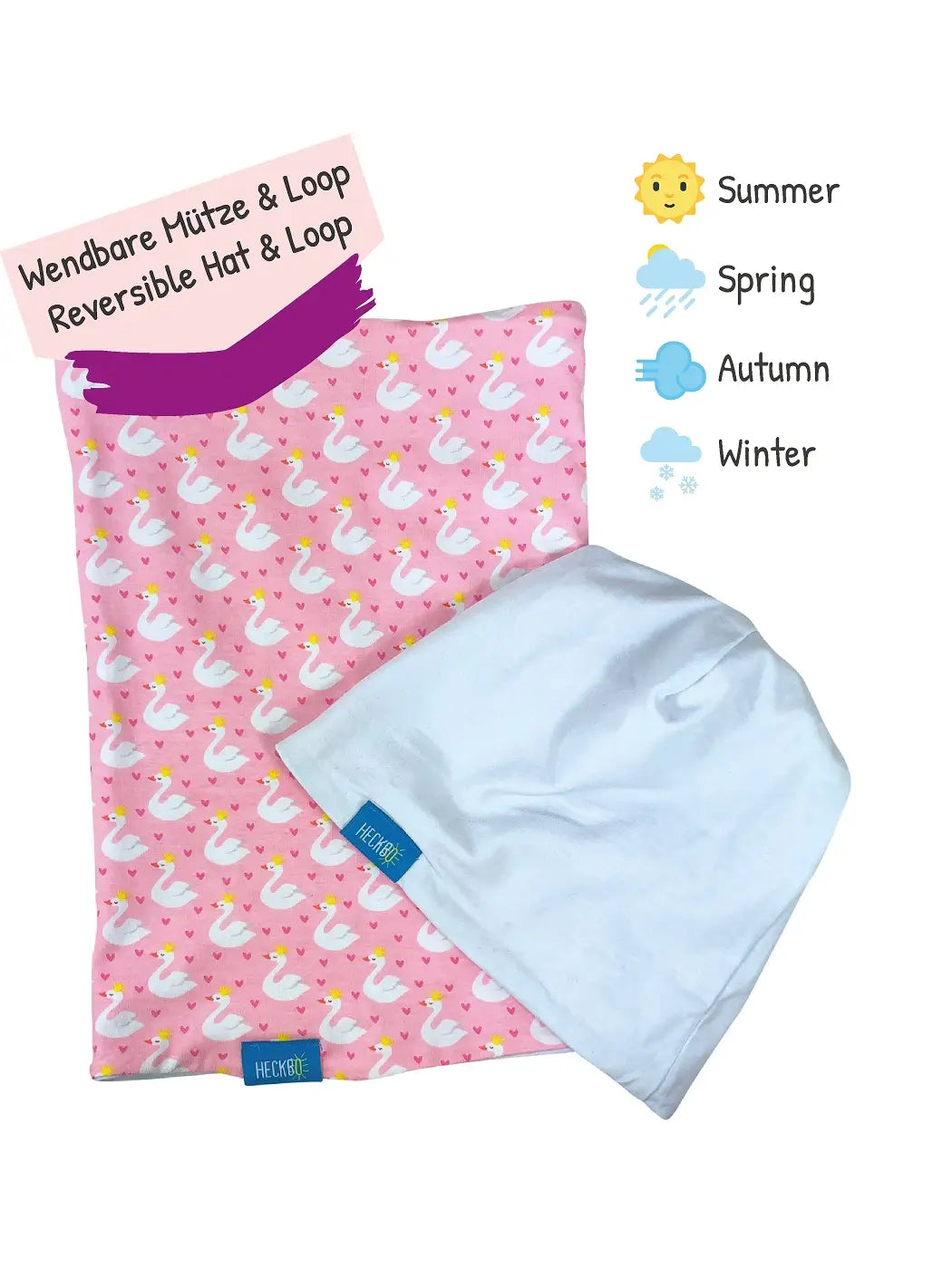 Das HECKBO Kinder Beanie Mütze & Schal Set ist ein cooles und praktisches Accessoire für kleine Schwan Liebhaber im Alter von 2 bis 8 Jahren. Das Set besteht aus einer Mütze und einem Loop-Schal. Das Highlight dieses Sets ist die Wendbarkeit der Weltraum Beanie Mütze und des passenden Loopschals. Beide Produkte können beidseitig getragen werden. Während eine Seite das farbenfrohe Schwan Design zeigt, ist die andere Seite in schlichtem Hellgrau gehalten. Dadurch lässt sich das Set vielseitig mit verschiedenen Kleidungsstücken kombinieren.