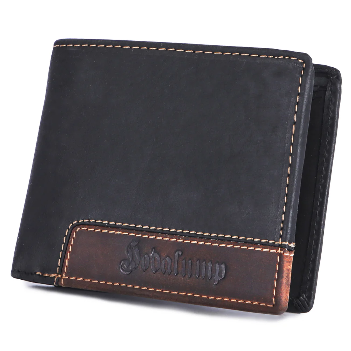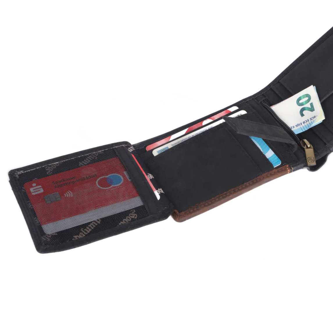 Die Hodalump Classic Geldbörse Lugge Special Edition vereint edles Design mit höchster Funktionalität. Gefertigt aus robustem Vintage-Echtleder in Braun und Schwarz, überzeugt sie durch Langlebigkeit und einen zeitlosen Look. Mit ihren kompakten Maßen von 12 cm x 9,5 cm x 2,5 cm passt sie perfekt in jede Tasche, ohne auf Stauraum zu verzichten. Sie bietet 12 Kartenfächer, 2 Scheinfächer, ein Münzfach, ein Sichtfach und ein praktisches Reißverschluss-Fach. Dank des integrierten RFID-Schutzes sind deine Karten sicher vor unbefugtem Auslesen. Ein stilvoller Begleiter für den Alltag.