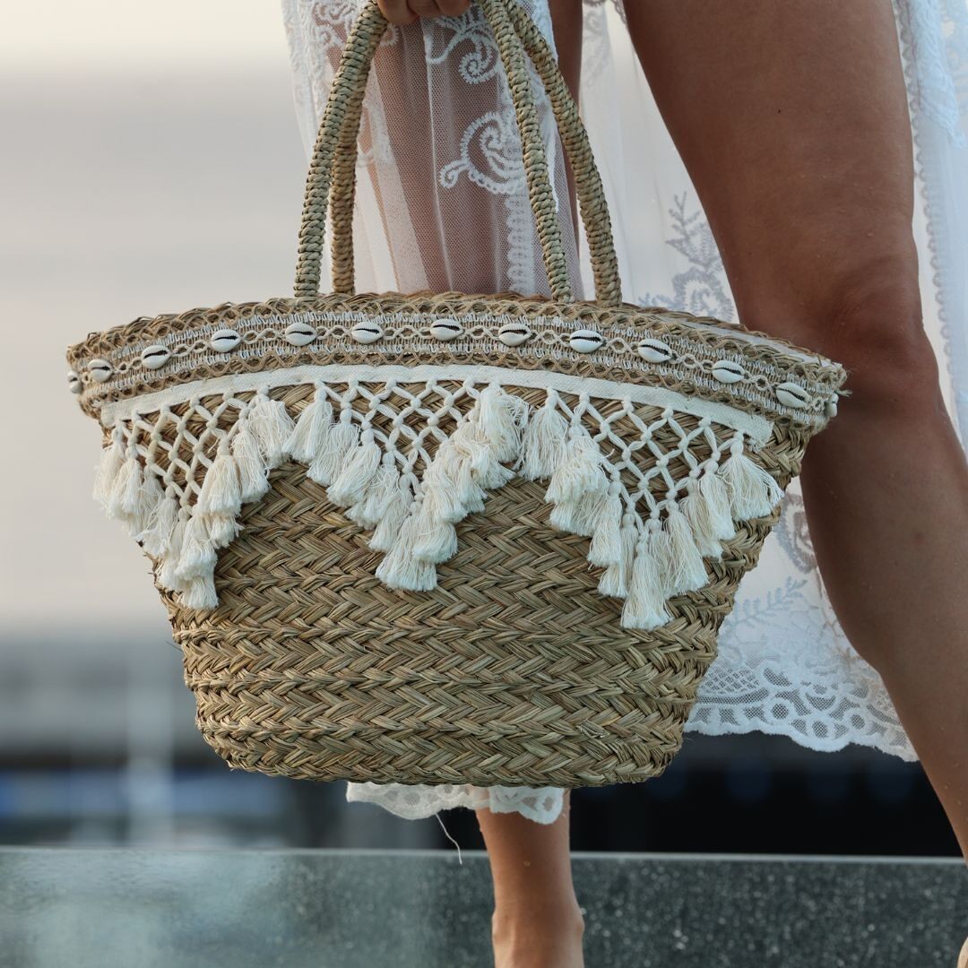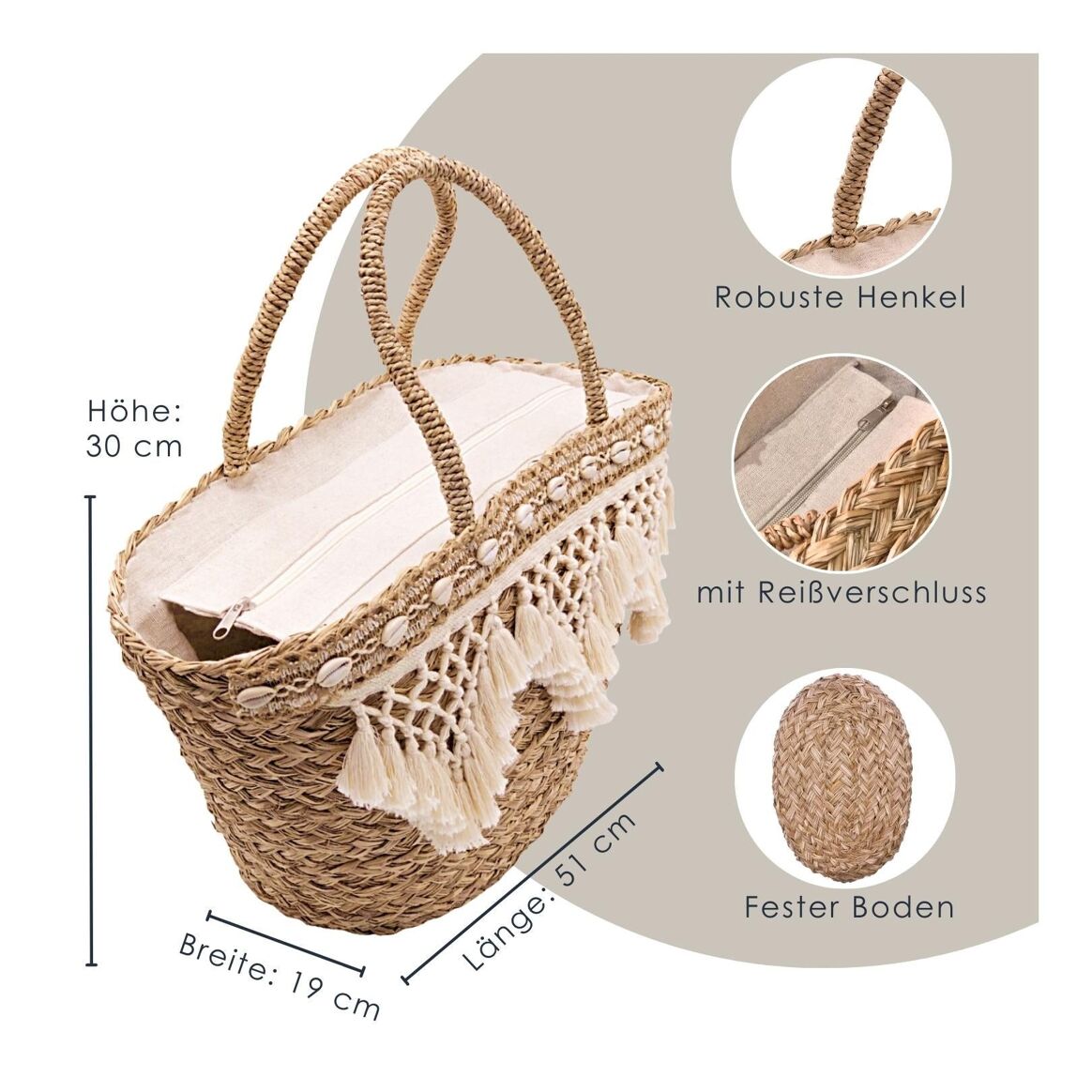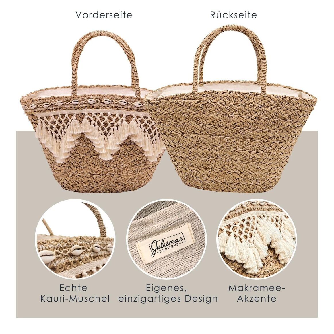 Die Julesmar Korbtasche „Ibiza“ ist dein perfekter Begleiter für den Sommer! Hergestellt aus 100% natürlichem Seegras, bietet diese geräumige Strandtasche ausreichend Platz für dein Handtuch, Bikini und mehr. Mit einem charmanten Makramee-Stil, Kaurimuscheln und Quasten auf der Vorderseite, bringt sie Boho Chic in jeden sonnigen Tag. Die Tasche verfügt über einen Reißverschluss und ein praktisches Innenfutter mit eingenähter Innentasche für zusätzliche Sicherheit.