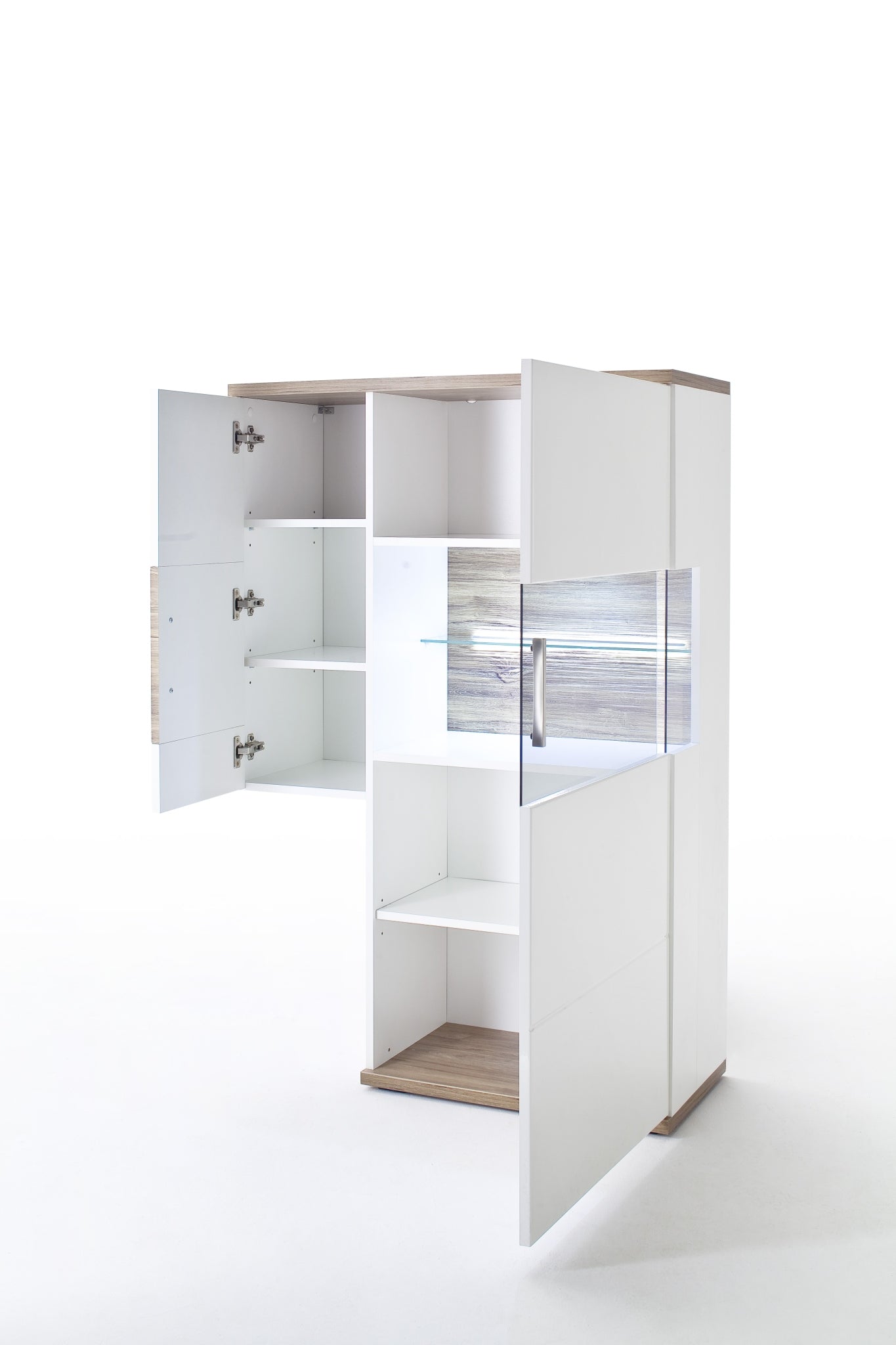 - Rückwand: hinter Glas: 3D-Optik Sterling Oak tiefzieh Nachbildung hinter Türen: Weiß Nachbildung