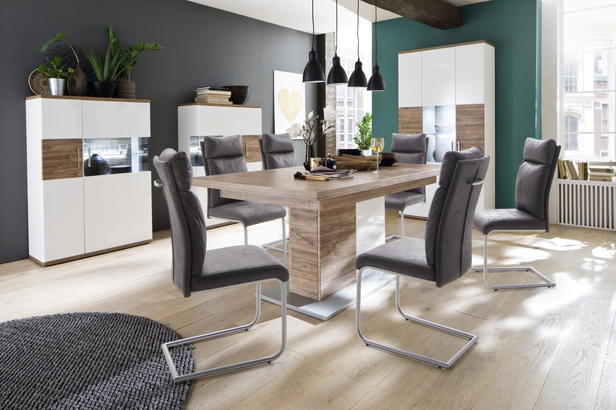 - Rückwand: hinter Glas: 3D-Optik Sterling Oak tiefzieh Nachbildung hinter Türen: Weiß Nachbildung