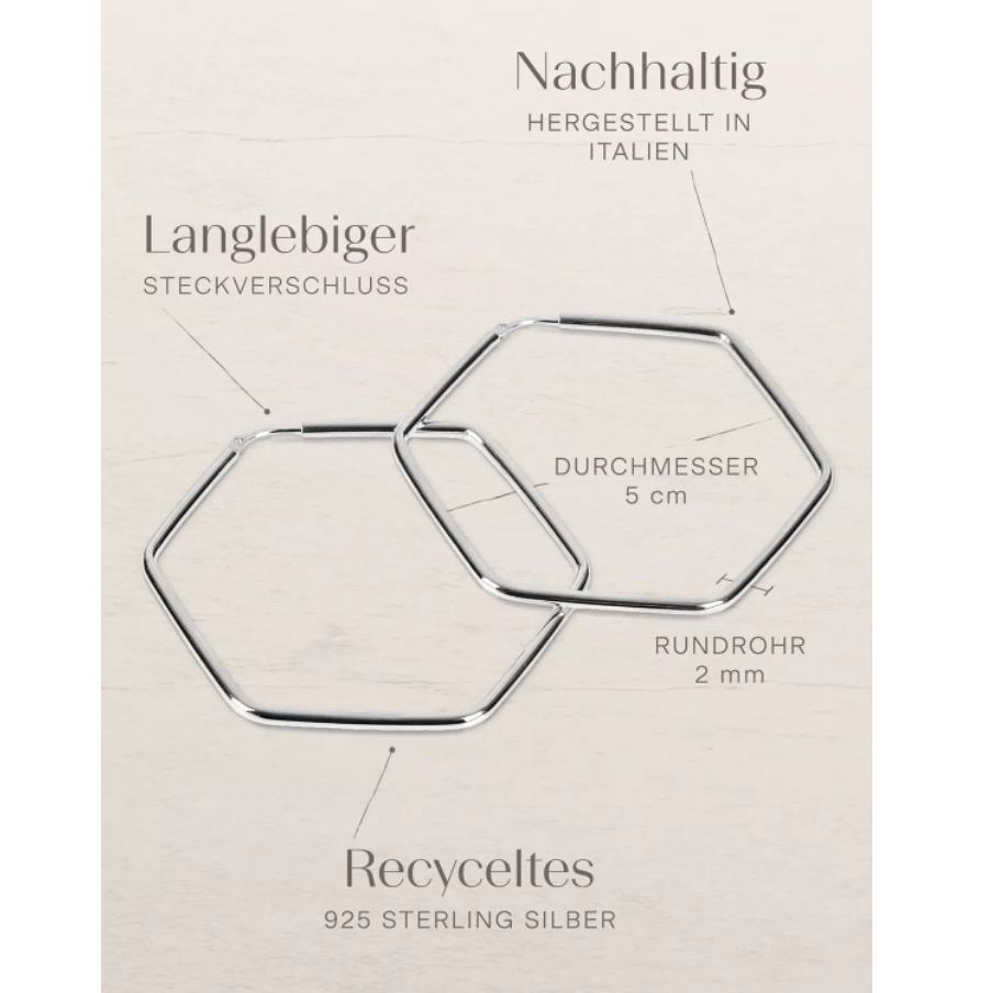 Entdecken Sie die zeitlosen Schönheiten: Die modabilé Creolen Hexagon, elegant und edel. Diese Sechseck-Ohrringe aus hochwertigem 925 Sterling Silber sind eine subtile Ergänzung zu Ihrem Stil. Diese Ohrringe verbinden Eleganz mit Robustheit. Hergestellt aus rhodiniertem 925 Sterling Silber, überzeugen die HEXAGON Creolen mit glatt polierter Oberfläche und kratzfester Qualität. Der robuste Steckverschluss sorgt für sicheren Halt. Mit einer Größe von 50 mm sind sie groß genug, um Aufmerksamkeit zu erregen, aber dennoch schlicht und vielseitig. Diese Kreationen sind nicht nur schön, sondern auch langlebig. Die Zertifizierung als 925 Sterling Silber gewährleistet Qualität und Langlebigkeit. Ein beiliegendes Silberputztuch unterstützt die Pflege, damit Sie lange Freude an diesen Echtschmuck Ohrringen haben. Die modabilé Creolen sind nicht nur ein Schmuckstück, sondern eine Botschaft der Eleganz und Qualität. Ob für den Alltag, das Büro, Partys oder besondere Anlässe – sie passen perfekt zu jedem Stil.