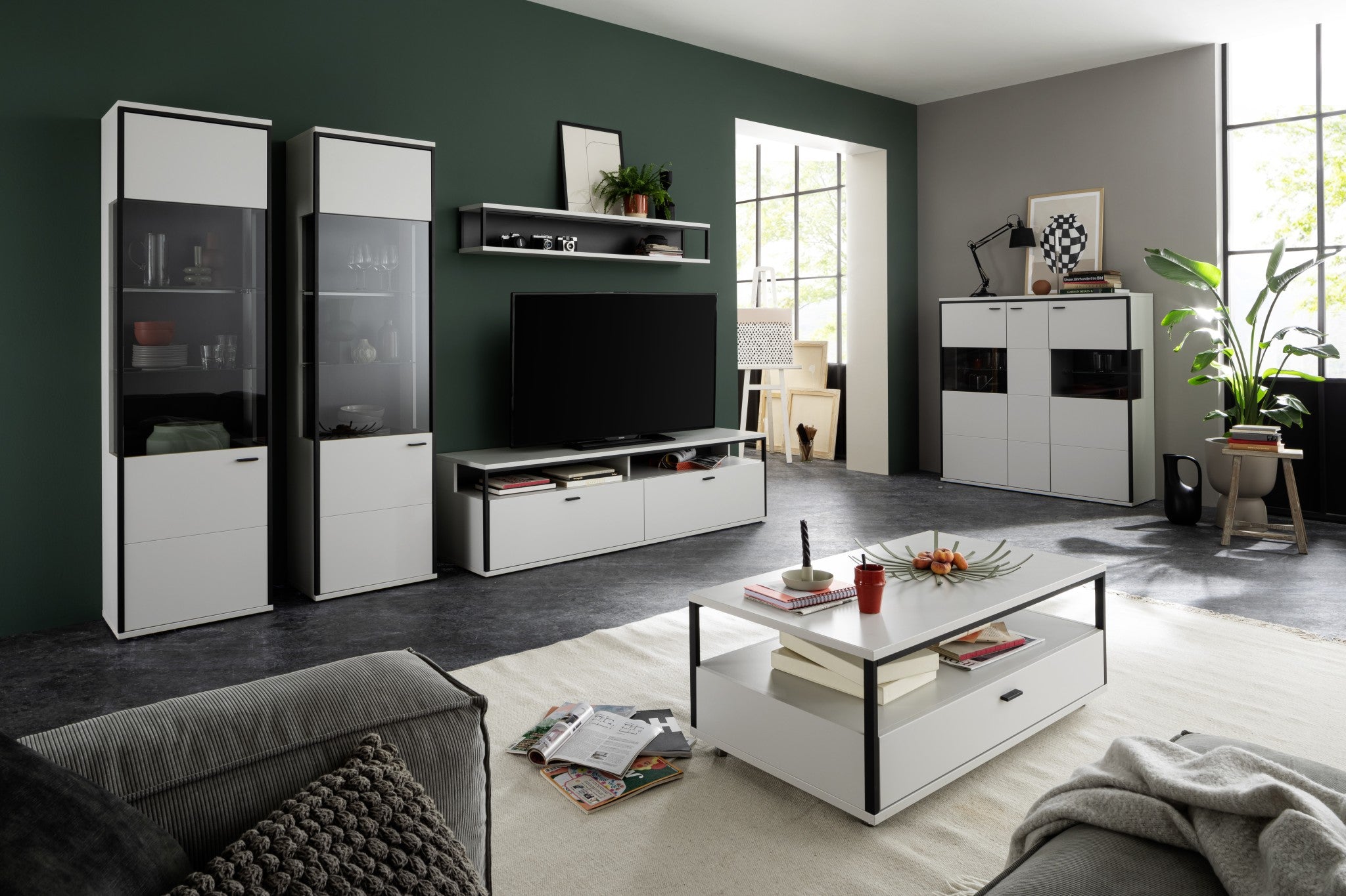 - Korpus: Modern white Melamin Nachbildung, Aluminiumprofil schwarzgrau
