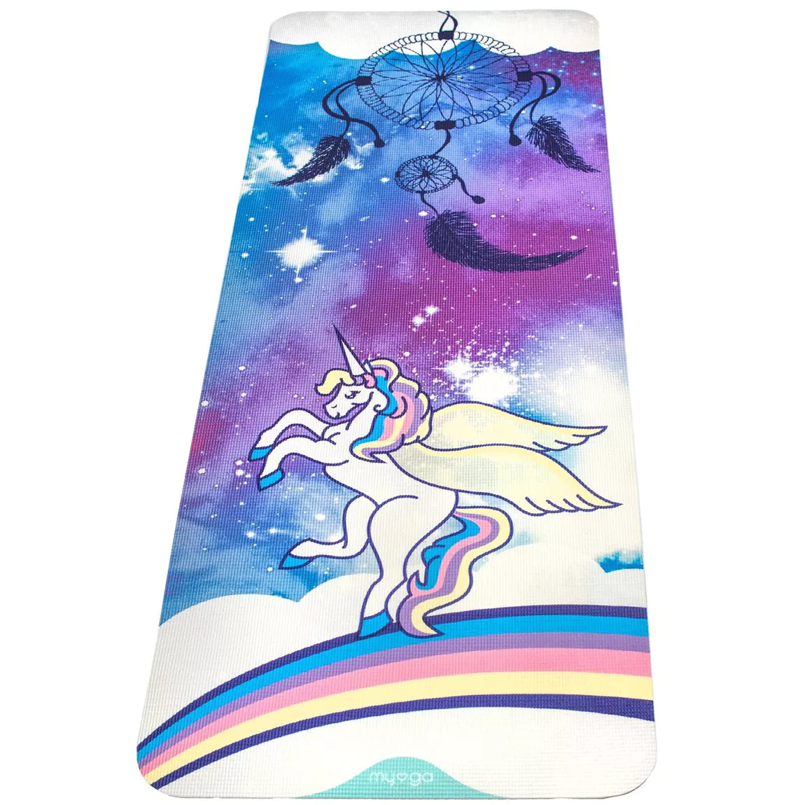 Tauchen Sie mit der Myga Kinder-Yogamatte – Jurassic Jungle in die abenteuerliche Jura-Welt ein und erkunden Sie den faszinierenden Dschungel. Diese Yogamatte wurde speziell für Kinder entwickelt, um ein einzigartiges, sicheres und unterhaltsames Training zu ermöglichen. Das kreative Design mit tropischen Blättern und berühmten Dinosaurierfiguren schafft eine inspirierende Umgebung für Ihr Kind. Die Matte bietet eine strukturierte, rutschfeste Oberfläche, die Ihrem Kind hilft, den Halt zu behalten. Mit einer Dicke von 6 mm sorgt sie für zusätzliche Polsterung, schützt Knöchel, Knie und andere empfindliche Knochen und ermöglicht ein komfortableres Üben. Auf der Rückseite sind 8 grundlegende Yoga-Posen abgebildet, die leicht zu merken und zu meistern sind. Sie hat die Maße 6 mm x 55 cm x 150 cm.Genießen Sie die Vorteile von Yoga mit Ihrem Kind, indem Sie die Myga Kinder-Yogamatte verwenden. Die passende Statement-Dreamcatcher-Matte schafft eine magische Welt voller Sternenstaub und fliegender Einhörner über dem Regenbogen, mit einem atemberaubenden Design, das Negativität herausfiltert und ein bezauberndes Einhorn zeigt.