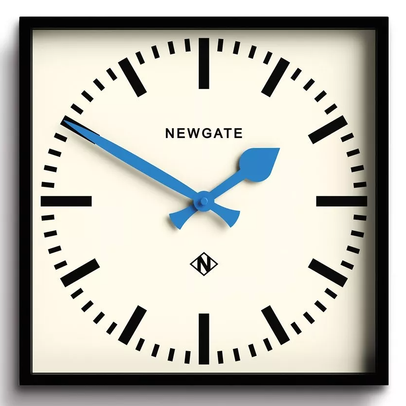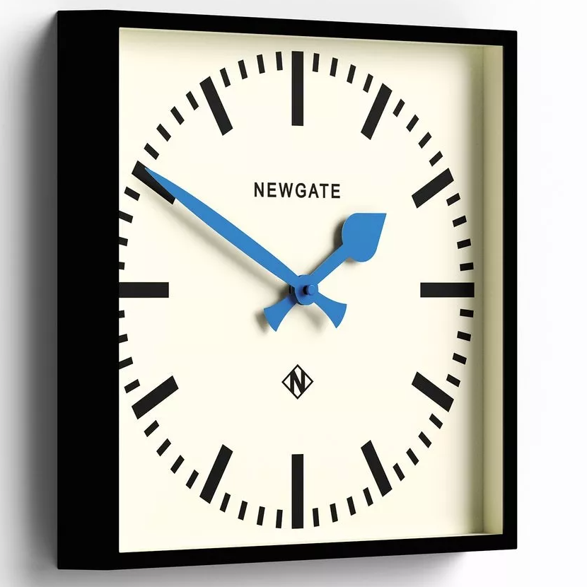 Die Newgate Wanduhr im klassischen Bahnhofsdesign verbindet Retro-Charme mit modernem Minimalismus. Ihr quadratisches, mattschwarzes Gehäuse wird durch kräftige blaue Metallzeiger und ein klares Zifferblatt stilvoll ergänzt. Mit ihren Maßen von 33,5 x 33,5 cm ist sie ein auffälliges Designstück für Küche, Wohnzimmer oder Büro. Gefertigt aus hochwertigem Acryl mit Silikonbeschichtung und Glaslinse, sorgt sie für langlebige Qualität. Eine AA-Batterie (nicht enthalten) betreibt das zuverlässige Quarzwerk. Diese Uhr ist ein stilvoller Farbakzent für jedes moderne Zuhause.