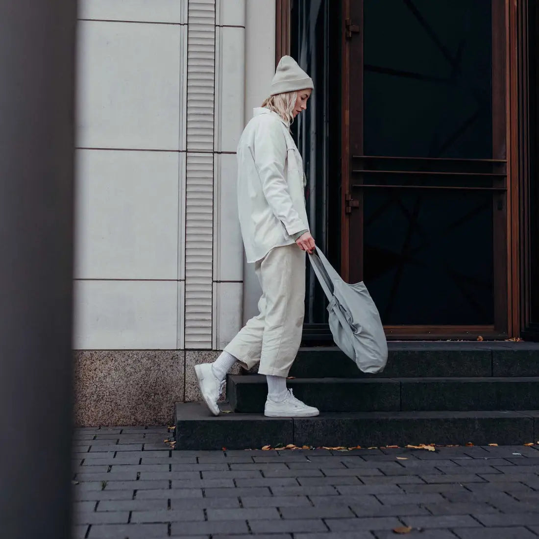 Notabag Original Grau vereint minimalistische Eleganz mit praktischer Vielseitigkeit. Mit einem Zug an den Gurten wird aus der Tragetasche ein Rucksack, der Ihre Hände frei lässt – ideal für Einkäufe, Reisen oder den Alltag. Die integrierte Innentasche eignet sich perfekt für Schlüssel oder Portemonnaie. Nicht in Gebrauch, lässt sich die Notabag platzsparend in einen handlichen Beutel (13 × 15,5 cm) falten. Hergestellt aus wasserabweisendem Premium-Polyester, ist sie wiederverwendbar, maschinenwaschbar und umweltfreundlich. Mit einer Größe von 45 × 65 cm bietet die Notabag viel Platz und setzt gleichzeitig ein Zeichen für Nachhaltigkeit – die clevere Wahl für Ihren Alltag.