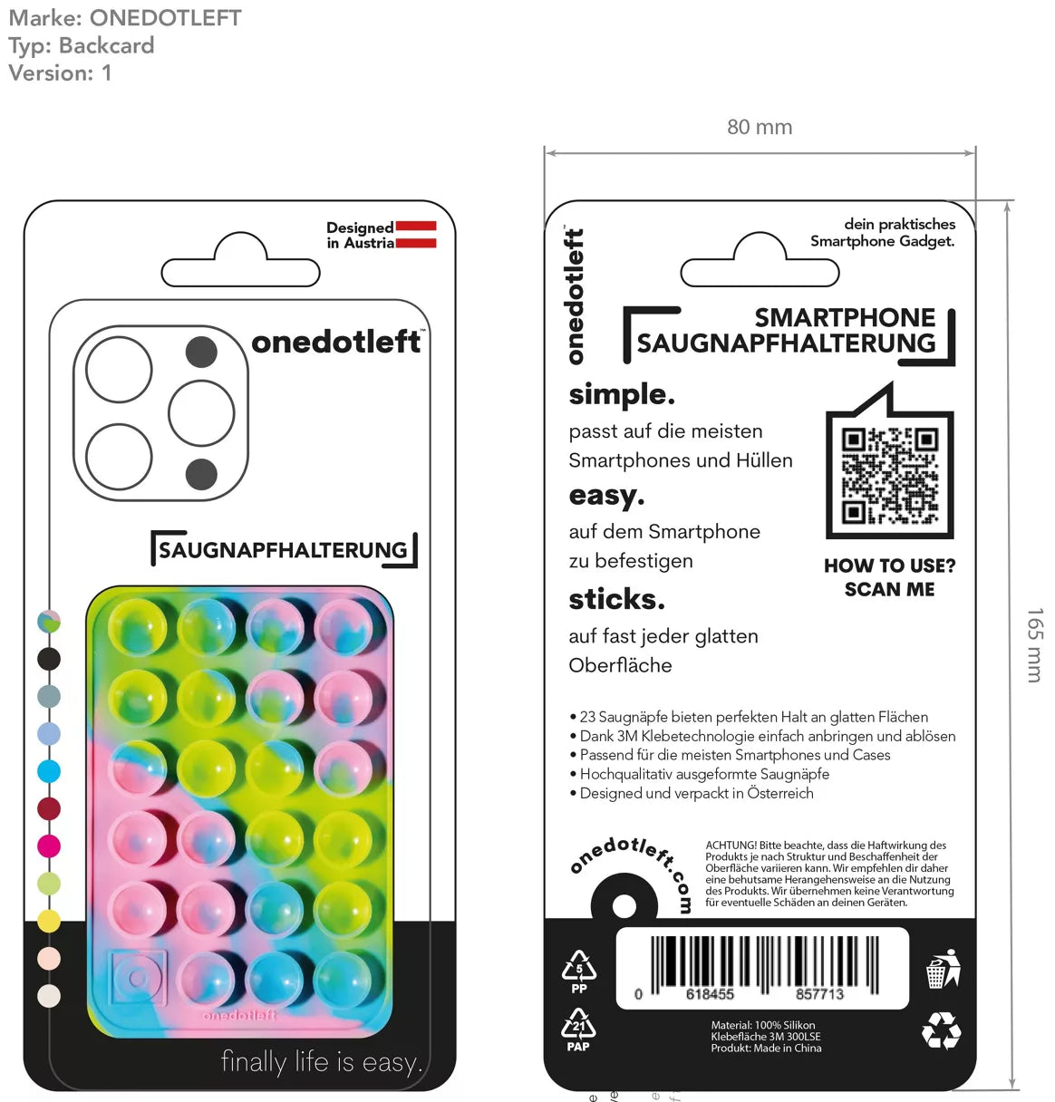 Die onedotleft™ Smartphone Saugnapfhalterung ist die praktische und innovative Antwort auf das ewige Problem, das Smartphone sicher zu platzieren. Mit 23 hochqualitativen Saugnäpfen und einer 3M-Klebetechnologie bietet sie perfekten Halt auf glatten Oberflächen – egal, ob in der Küche, im Fitnessstudio oder bei Videokonferenzen. Diese clevere Halterung ist passend für die meisten Smartphones und Cases und überzeugt durch ihr robustes Design. Entwickelt und verpackt in Österreich, steht onedotleft™ für Qualität und Stil. Schluss mit rutschenden Handys und wackeligen Konstruktionen – mit onedotleft™ wird dein Alltag endlich stressfrei.