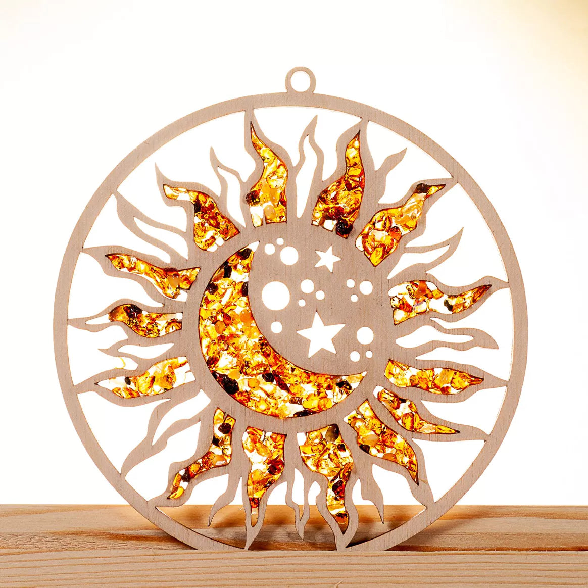 Die Raduly Suncatcher mit Bernstein in Birkenholz, in der bezaubernden Form von Sonne & Mond, sind kunstvoll gelasert und sorgfältig von Hand mit Bernstein gefüllt. Diese faszinierenden Dekorationsstücke sind nicht nur ein Blickfang, wenn sie vor dem Fenster aufgehängt werden, sondern können auch mit ihren zwei Magneten problemlos am Kühlschrank befestigt werden.