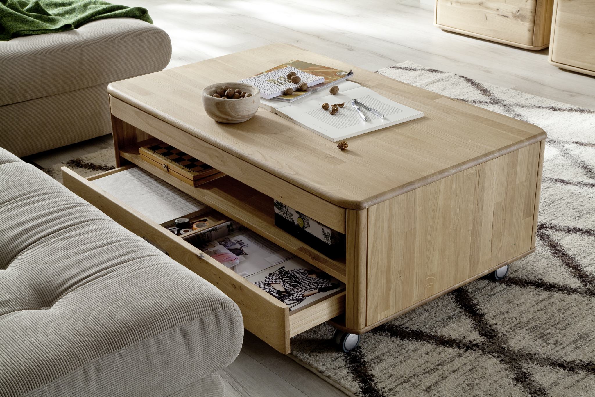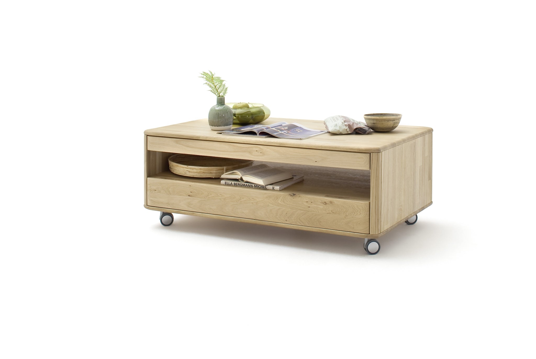 - Tischplatte & Korpus: Balkeneiche Bianco massiv keilverzinkt