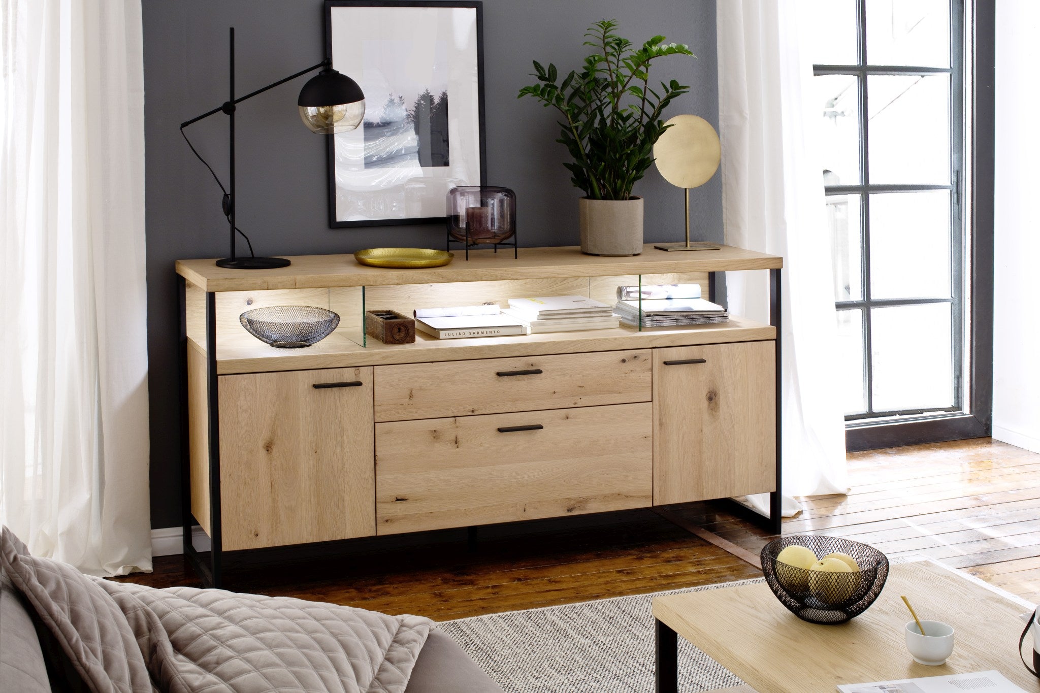 - Rückwand: sichtbar: Asteiche furniert hinter Türen und Schubkästen: Eiche Bianco Nachbildung