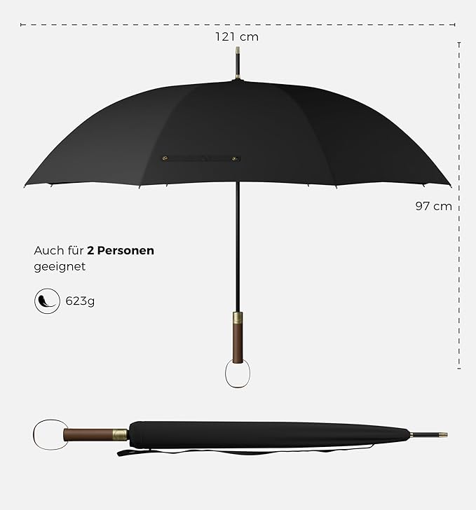 Der Sapor Design Stockschirm in XXL-Größe (123 cm Durchmesser) bietet stilvollen Schutz für Damen und Herren und ist perfekt für 2 Personen. Dieser sturmsichere Regenschirm kombiniert edle Details, robuste Strebenkonstruktion und den Lotus-Effekt für maximalen Schutz und langlebige Qualität. Mit Auf-Automatik, hochwertigem Holzgriff und eleganter Spitze ist er ideal für Business, Hochzeiten oder den Alltag. Ein exklusiver Begleiter, der durch höchste Qualität und Funktionalität überzeugt.