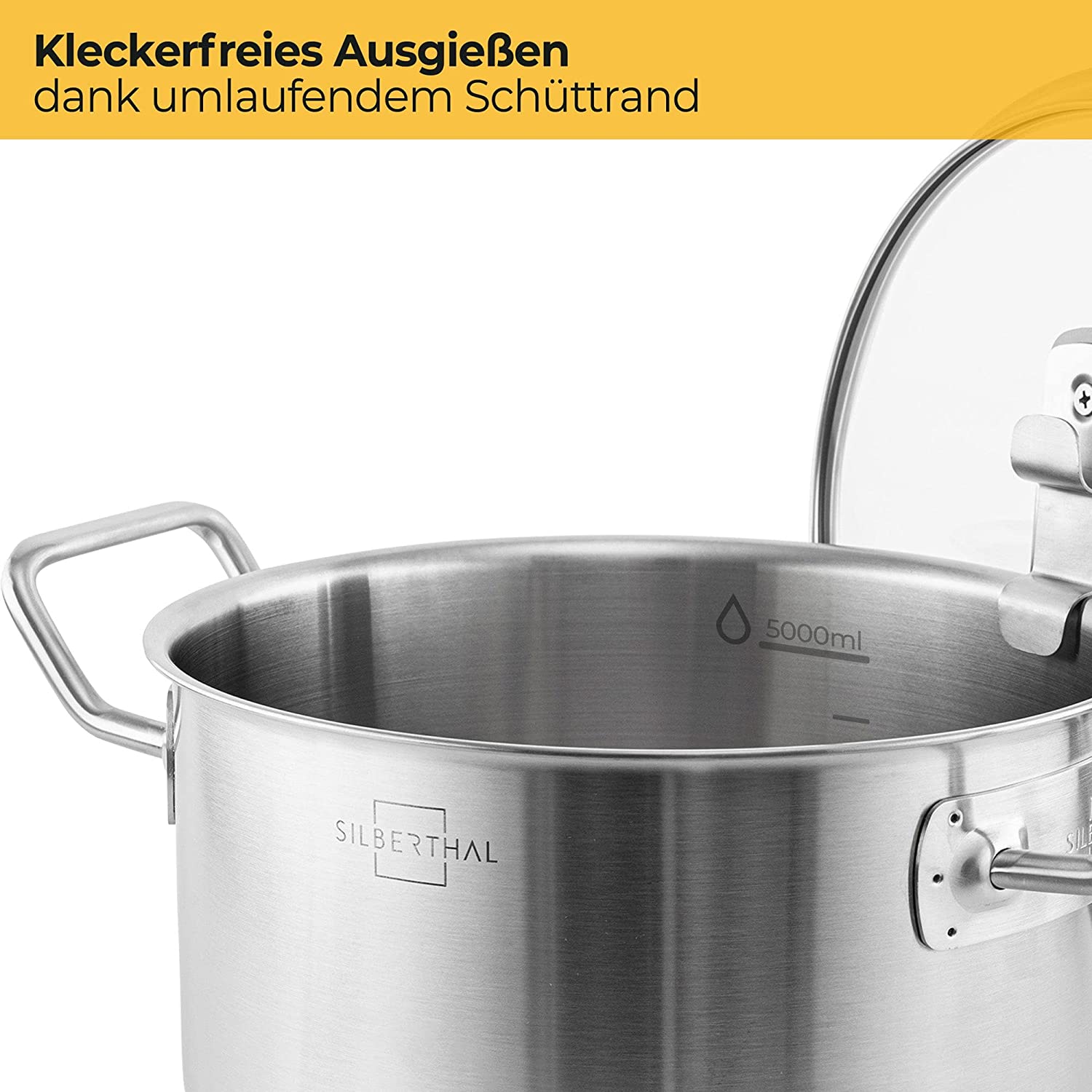 Bereite köstliche Mahlzeiten stressfrei mit dem SILBERTHAL Induktions-Kochtopf zu. Dieser elegante 24 cm Topf aus hochwertigem Edelstahl hat eine Kapazität von 5,8 Litern und ist für alle Herdarten und den Ofen bis zu einer Temperatur von 250°C geeignet. Der Topf bietet eine optimale Wärmeverteilung durch seinen 3-lagigen Sandwichboden und erhält wertvolle Nährstoffe und Vitamine der Speisen. Die ergonomischen, stabilen Griffe bleiben während des Kochvorgangs kühl, während der hitzebeständige Deckel aus Güteglas für energiesparendes Sichtkochen sorgt. Der Topf ist langlebig und wird mit einer 10-jährigen Garantie und nützlichen Extras wie einer Anwendungsanleitung und einem Mikrofasertuch zur Reinigung geliefert.