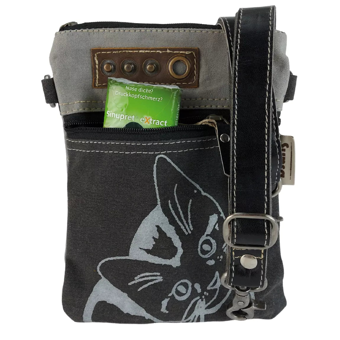 Entdecken Sie die Einzigartigkeit und Vielfalt der Sunsa Damen Umhängetasche – eine perfekte Kombination von Stil und Nachhaltigkeit. Unsere Upcycling Taschen tragen nicht nur zu einem einzigartigen Design bei, sondern leisten auch einen Beitrag zur Abfallreduzierung und Ressourcenschonung. Diese stilvolle Umhängetasche besteht aus einer hochwertigen Kombination von robustem Canvas und echtem, weichem Leder. Mit Maßen von ca. 17×24 cm ist sie kompakt und dennoch geräumig genug, um Ihre Essentials sicher zu verstauen. Das Hauptfach ist mit einem Reißverschluss gesichert, ebenso wie das Frontfach, das zusätzlichen Stauraum bietet. Im Inneren der Tasche befindet sich ein weiteres praktisches Reißverschlussfach, um Ihre Wertsachen sicher aufzubewahren. Der verstellbare Henkel mit einer Länge von ca. 150 cm ermöglicht es Ihnen, die Tasche bequem als Crossbody oder Schultertasche zu tragen. Das schwarze und graue Katzenmotiv auf der Frontseite verleiht der Umhängetasche eine verspielte Note und macht sie zum perfekten Begleiter für jeden Anlass. Tauchen Sie ein in die Welt von Sunsa und erleben Sie Stil mit einem Hauch von Nachhaltigkeit.