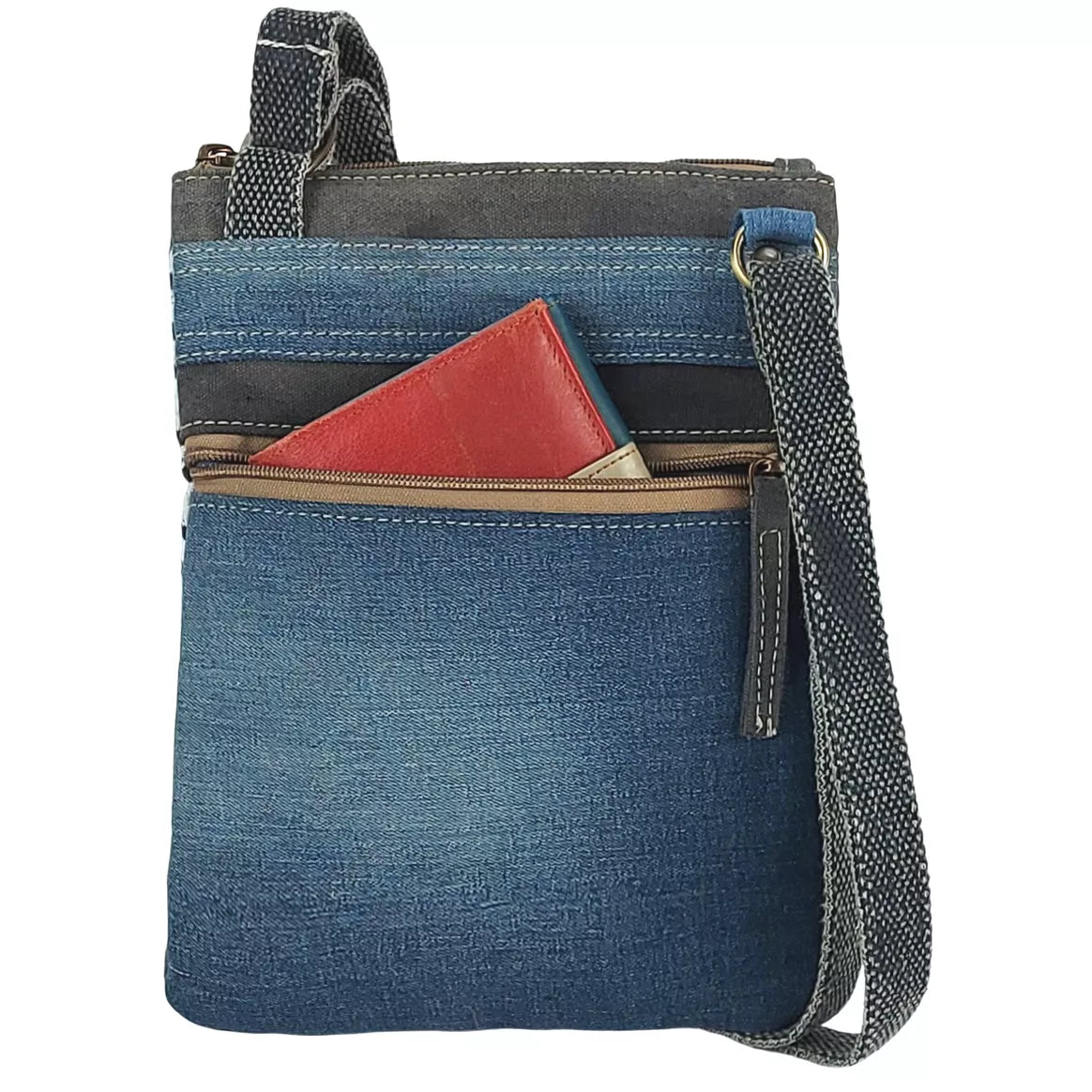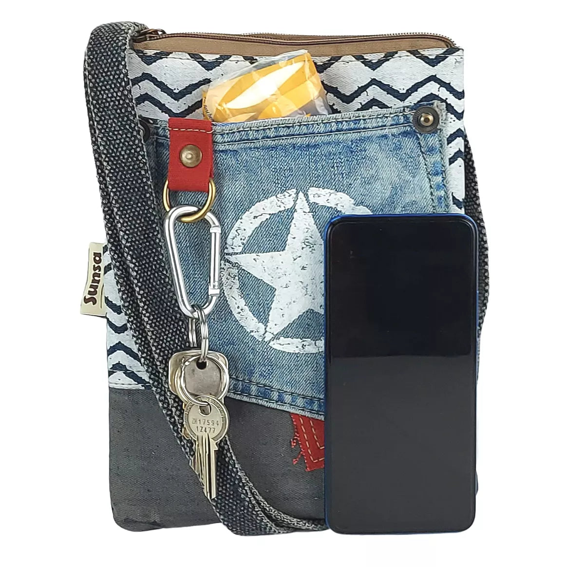 Die Sunsa Damen Kleine Nachhaltige Umhängetasche ist der ideale Begleiter für umweltbewusste Frauen. Mit einer Größe von 25x20x2 cm und einem verstellbaren Henkel von 84-145 cm bietet diese Crossbody Tasche ausreichend Platz für Ihre Essentials. Die Tasche verfügt über ein Haupt- und Rückfach mit Reißverschluss sowie ein Einsteckfach, das aus einer originalen Jeanshosentasche gefertigt ist. Diese umweltfreundliche Tasche besteht aus 100% Baumwolle, recycelten Jeans und Canvas, wiegt nur 220 g und bietet ein Volumen von ca. 1 Liter. Das Design dieser Tasche zeichnet sich durch einen Vintage-Retro-Stil mit einem Stern auf der Vorderseite aus, der durch einen Metallring für Schlüsselanhänger betont wird. Sunsa setzt auf Nachhaltigkeit, indem sie recycelte Jeans und andere gebrauchte Materialien verwendet, um Müll zu reduzieren und den Verbrauch neuer Ressourcen zu minimieren. Darüber hinaus sind Sunsa Canvas Taschen komplett vegan, ohne tierische Bestandteile. Die Wahl von veganen Produkten trägt dazu bei, Tiere zu schützen und die Umwelt zu schonen.