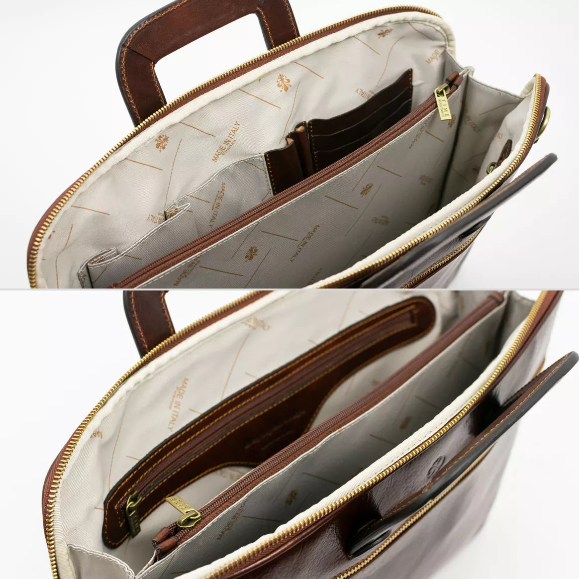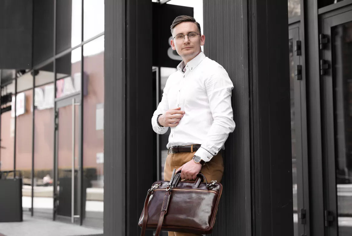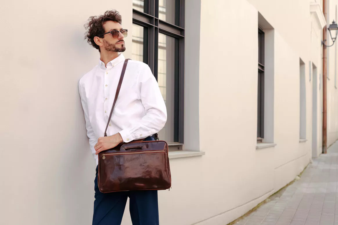 Die Brave New World Leder Aktentasche von Time Resistance verkörpert Selbstbewusstsein und Eleganz für moderne Männer, die ihre Ziele mit Sicherheit erreichen wollen. Diese Aktentasche wird zu 100% in Italien handgefertigt und zeigt hochwertige Verarbeitung mit Messingbeschlägen, reißfestem Futter und YKK-Reißverschlüssen, die auf jahrhundertealter Handwerkskunst basieren. Maximaler Komfort ist in Ihrem Alltag gesichert. Innen- und Außenfächer bieten reichlich Platz für Organisation, ein gepolsterter, verstellbarer Schultergurt ermöglicht angenehmes Tragen. Die praktischen Steckgriffe sind perfekt für den schnellen Zugriff. Die Tasche ist geeignet für A4-Dokumente und Laptops. Abmessungen: Höhe 28 cm, Länge 39 cm, Breite 9 cm, Gewicht 1,8 kg, Gurtlänge 46-52 cm. Jede Brave New World Tasche ist ein Unikat. Hergestellt aus vollnarbigem Rindsleder, von Hand gefärbt mit pflanzlichem Gerbverfahren, bewahrt sie die natürliche Optik des Leders und verleiht jeder Tasche ihren individuellen Look.