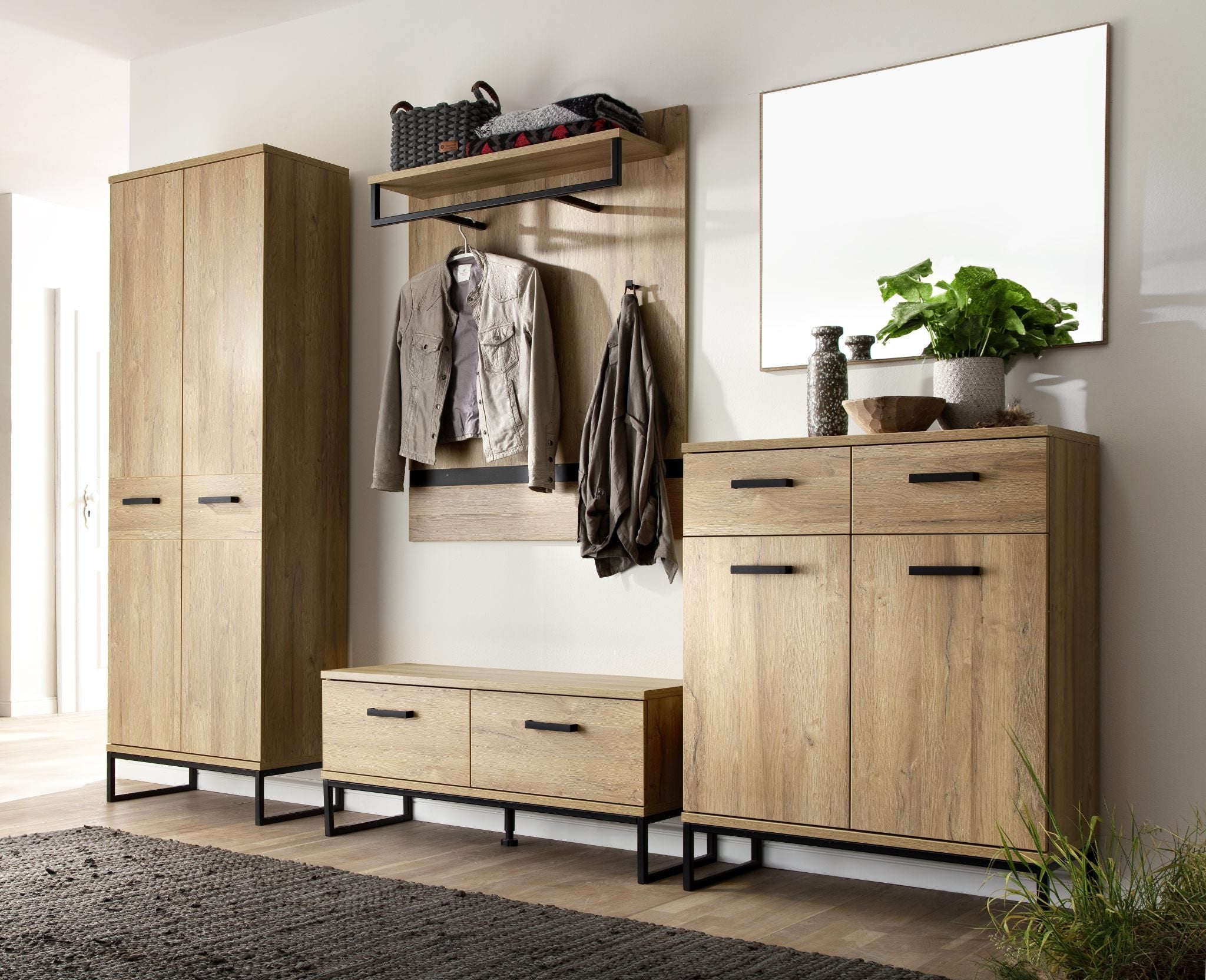 - Fußgestell, Scharniere, Kleiderstange & Griffe: Metall schwarz matt