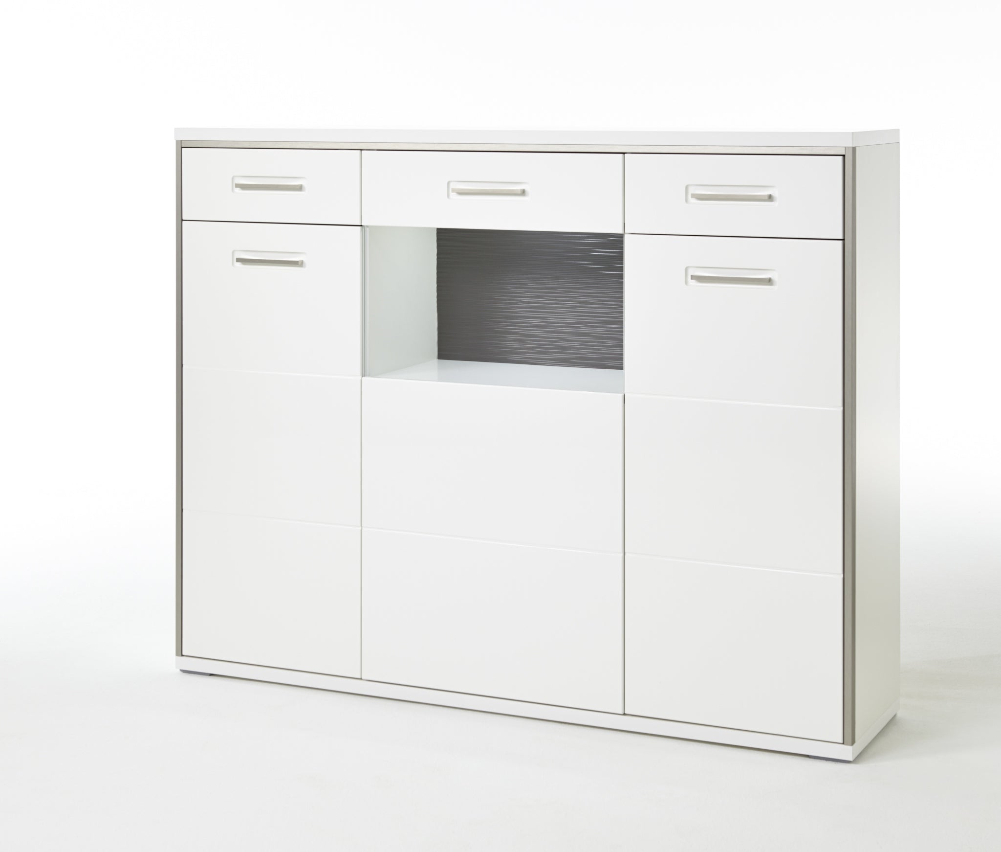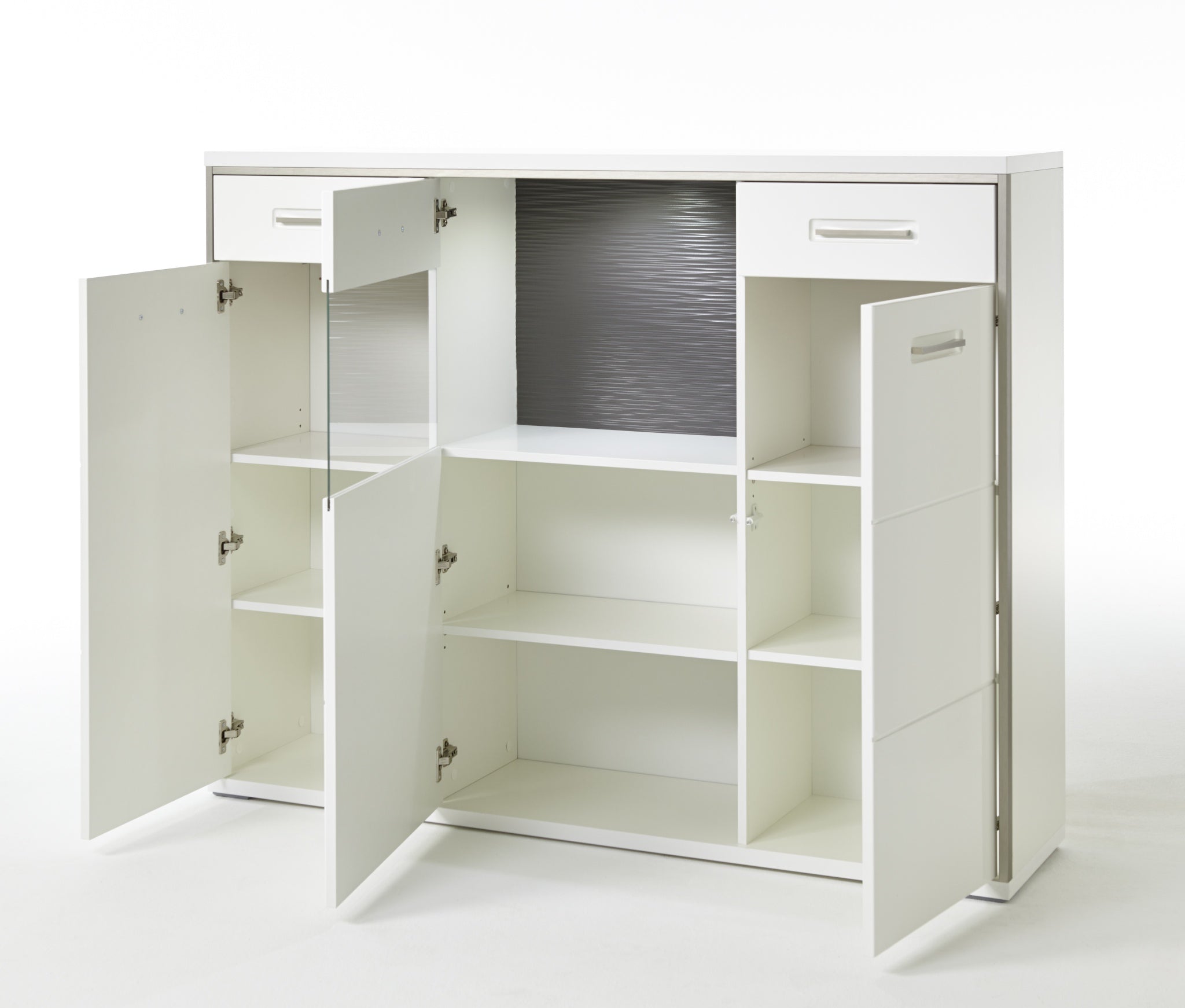 - Rückwände: hinter Türen & Schubkästen weiß NB hinter Glas grau 3D Optik NB