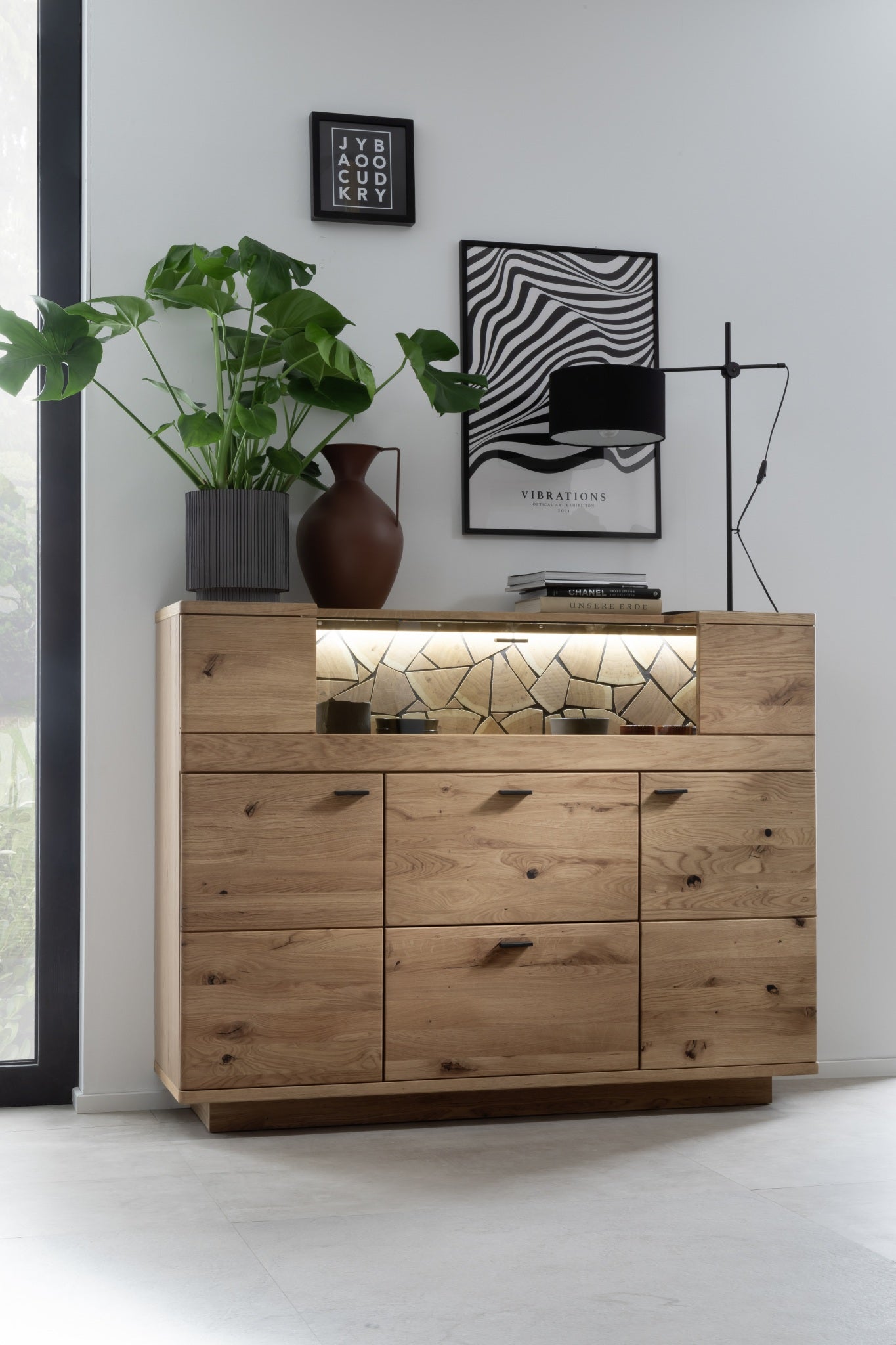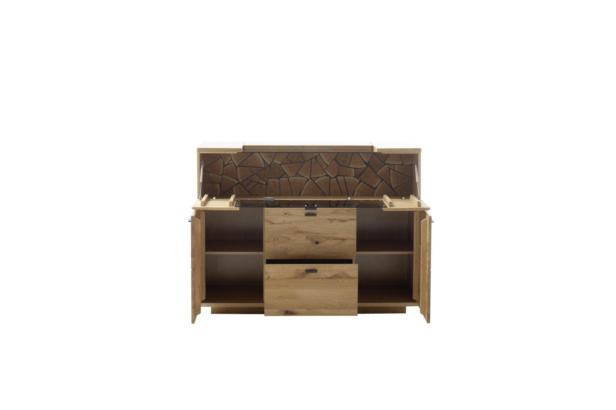 - Rückwand: sichtbar: Scheitholz hinter Türen & Schubkästen: Eiche Dekor
