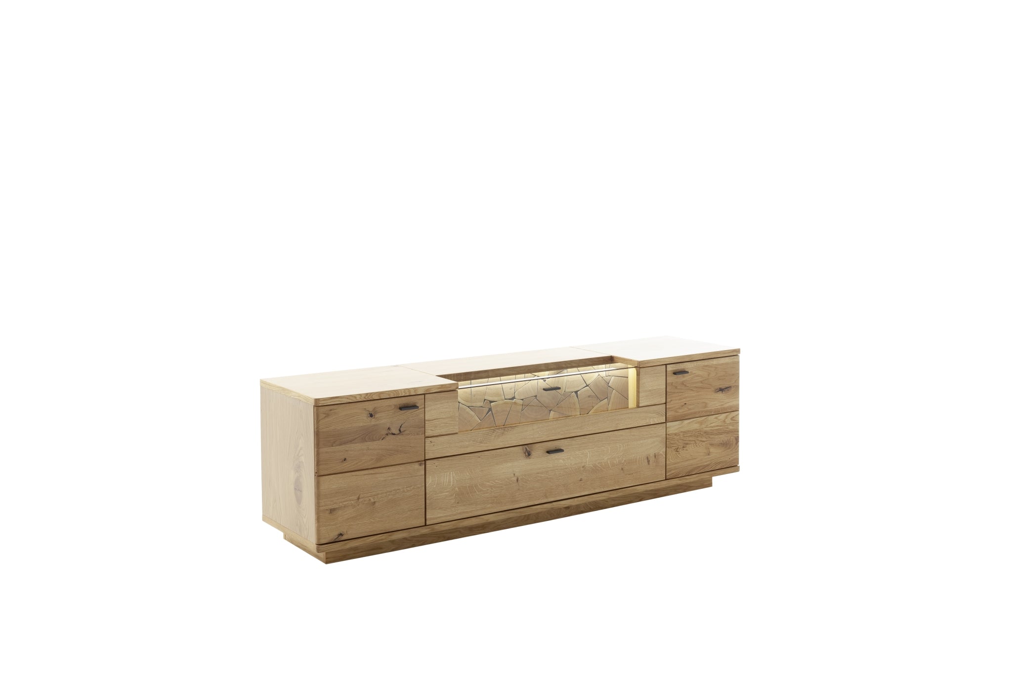 - Rückwand: sichtbar: Scheitholz hinter Türen & Schubkästen: Eiche Dekor