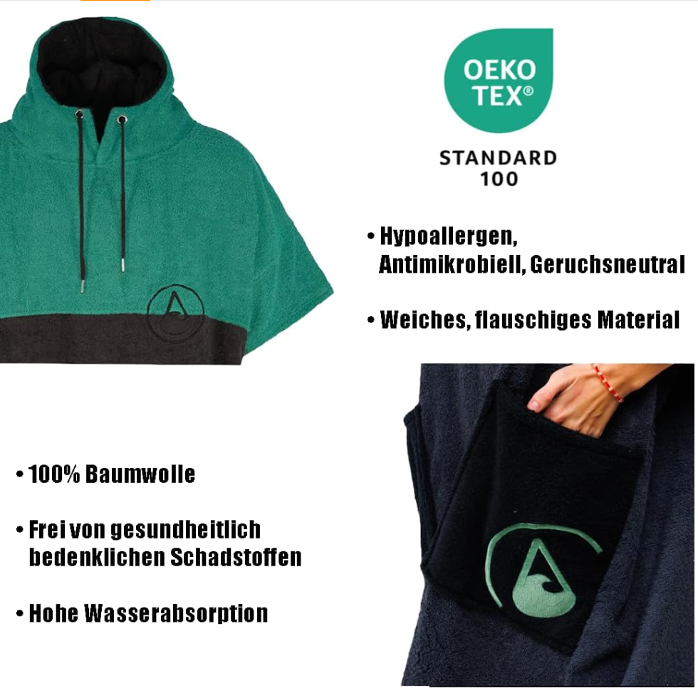 Der WAVE HAWAII Poncho Move Surfponcho ist die ideale Umkleidehilfe für Schwimmen, Strand und Surfen. Hergestellt aus flauschigem Frottee und zu 100% aus Baumwolle, zertifiziert nach Öko Tex Standard 100, ist dieser Bade- und Duschponcho perfekt für Damen, Herren und Erwachsene geeignet. Dieser kuschelige und warme Poncho schützt vor neugierigen Blicken und hält dich trocken. Die zweilagige Kapuze mit hohem Kragen und Kordel bietet zusätzlichen Schutz für deinen Kopf. Die große Fronttasche ist praktisch für Utensilien wie Shampoo, Bürste oder kalte Hände. Mit Maßen von 105 x 80 cm ist der Poncho für Körpergrößen von ca. 170 – 190 cm geeignet. Ideal für den Einsatz nach dem Duschen, beim Sport, zu Hause, im Freizeitbad, in der Therme, beim Wassersport, in der Sauna, im Fitnessstudio oder beim Camping. Der Poncho ist nicht nur praktisch, sondern auch ein echter Hingucker!