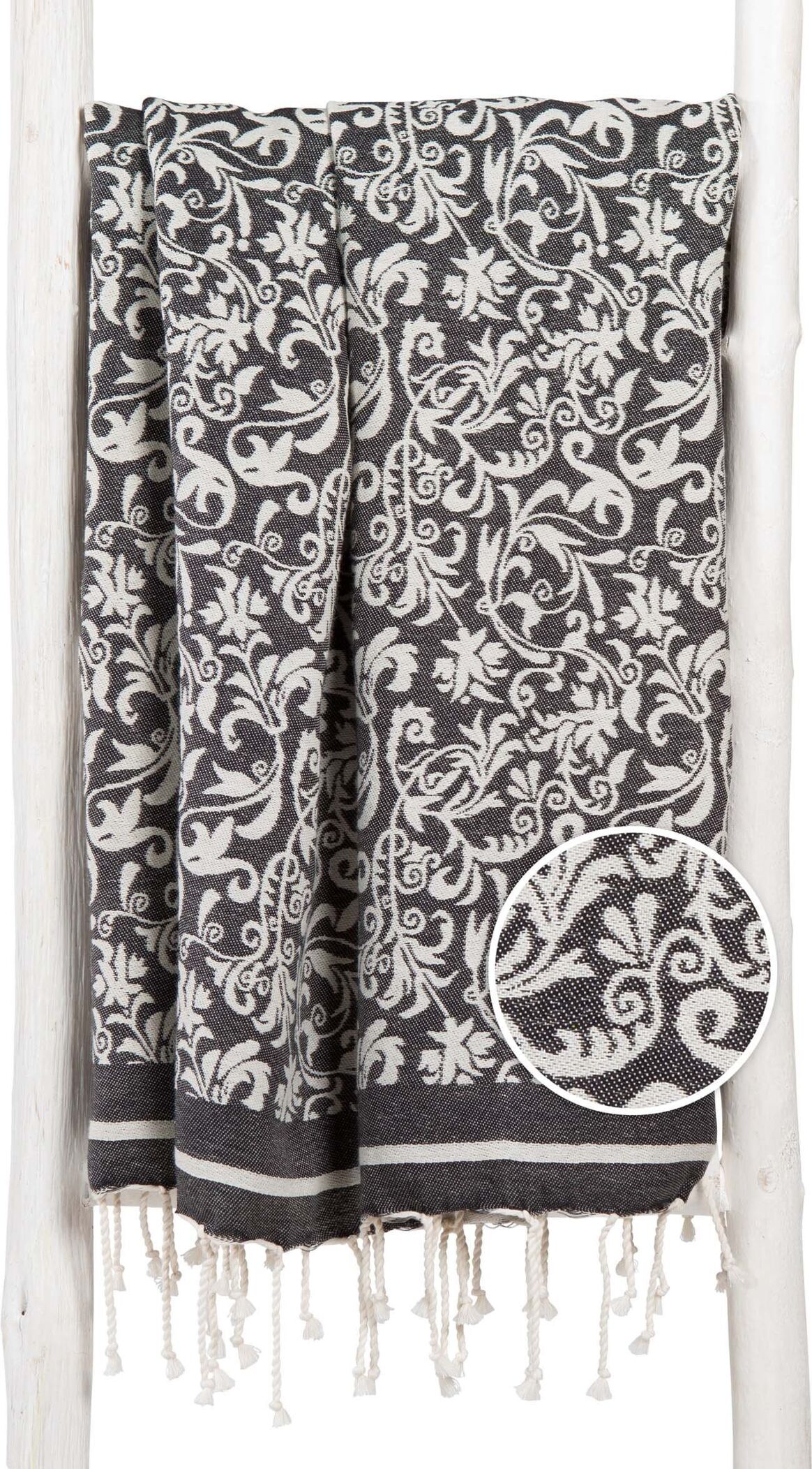 Das ZusenZomer Fouta Hammam Handtuch BLUME in Schwarz für Frauen ist ein luxuriöses Handtuch mit einem wunderschönen, eingewebten Blumenmuster. Hergestellt aus 100% hochwertiger Baumwolle, bietet es ein weiches und angenehmes Hautgefühl. Mit einer Größe von 100×190 cm und einem Gewicht von 420 g ist es leicht, kompakt und gleichzeitig super saugfähig. Dieses zweiseitige Handtuch überrascht mit einem einzigartigen Farbwechsel auf beiden Seiten und ist perfekt als modisches Strand- oder Badetuch. Ein echtes Design-Highlight, das Funktionalität und Stil vereint.
